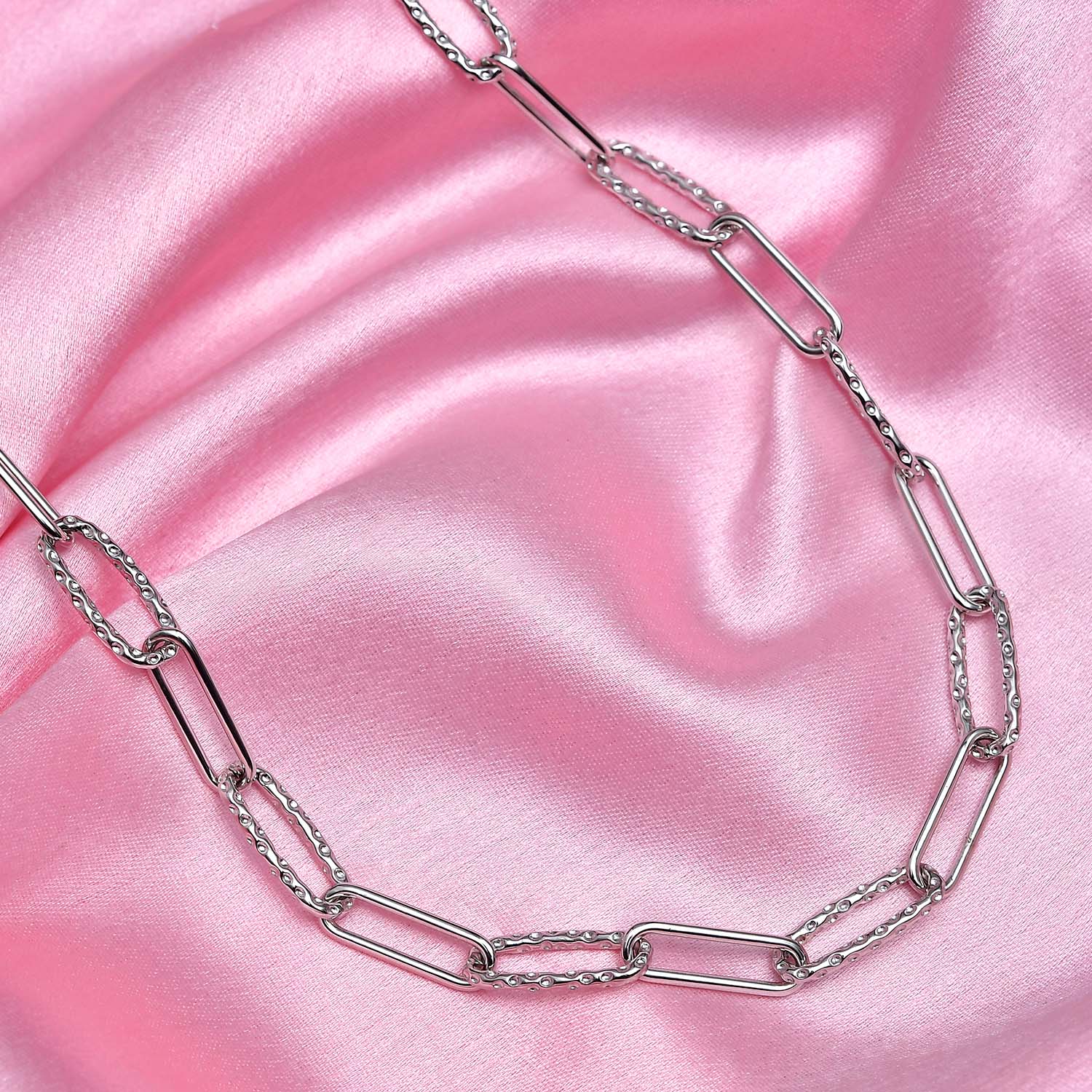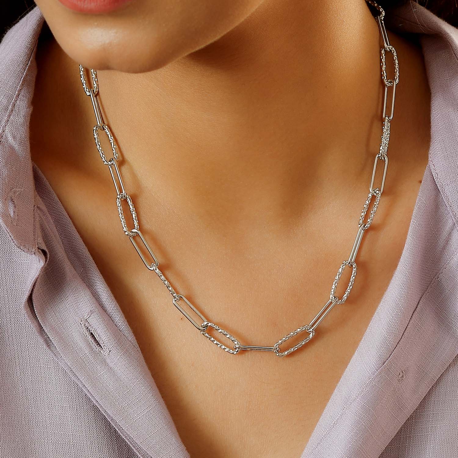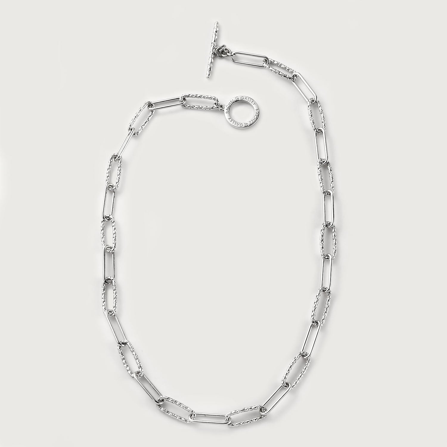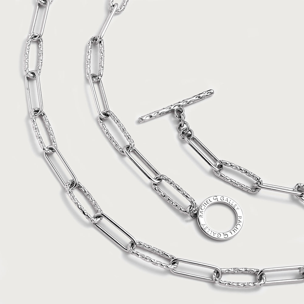 Diese Halskette verleiht dem beliebten Paperlink-Design eine charakteristische Note und ist mit Rachels exklusiver Allegro-Arbeit versehen. Dieses charakteristische Stück ist in einer Länge von 18 Zoll mit einem T-Steg-Verschluss erhältlich und passt perfekt zu mehrschichtigen Halsketten , sieht aber auch einzeln phänomenal aus.