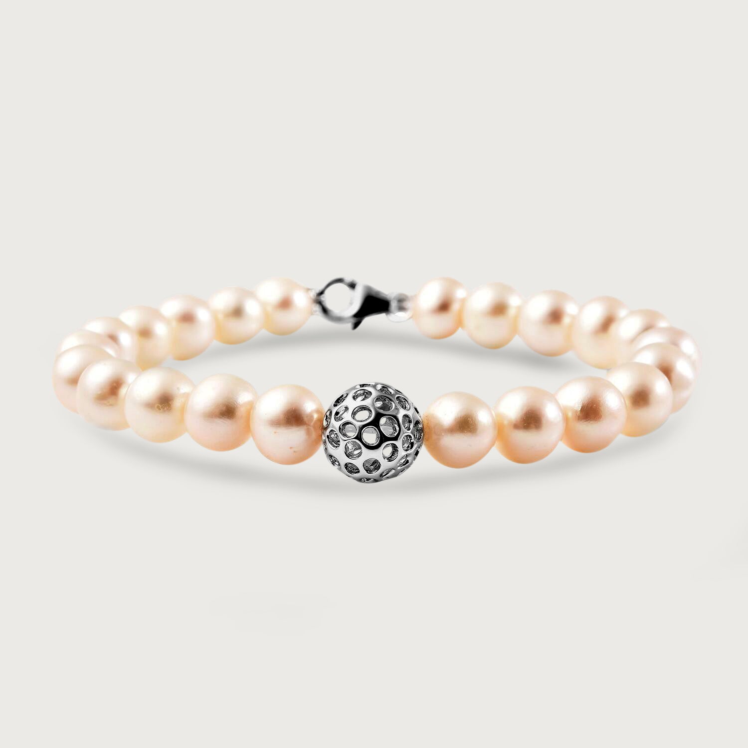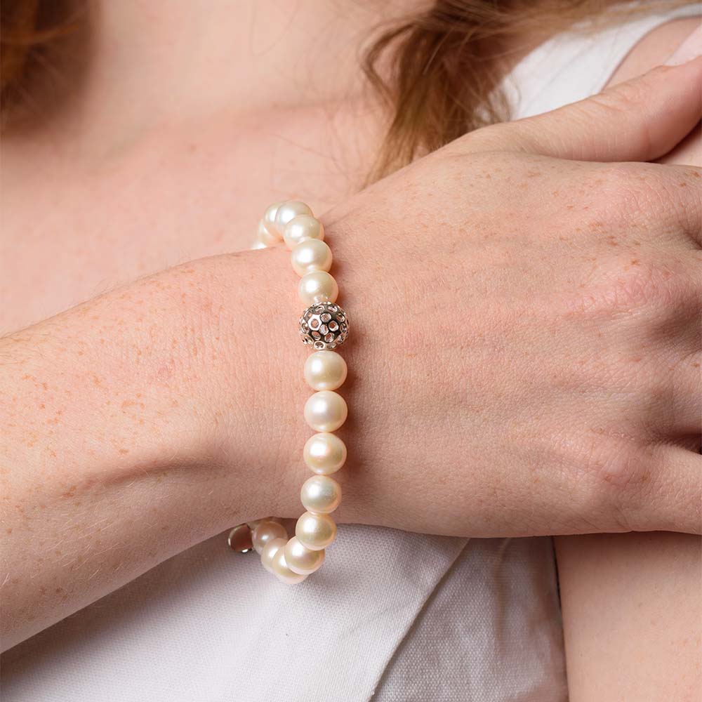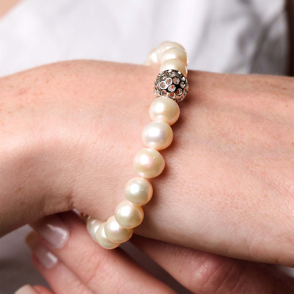 Rachels charakteristisches Meisterwerk mit einer wunderschönen Mischung aus Allegro-Globus-Charme inmitten des Glanzes klassischer weißer Süßwasserperlen. Ein fesselndes Design, das mit Ihren Uhren und Ihrer anderen Handgelenksbekleidung kombiniert werden kann.