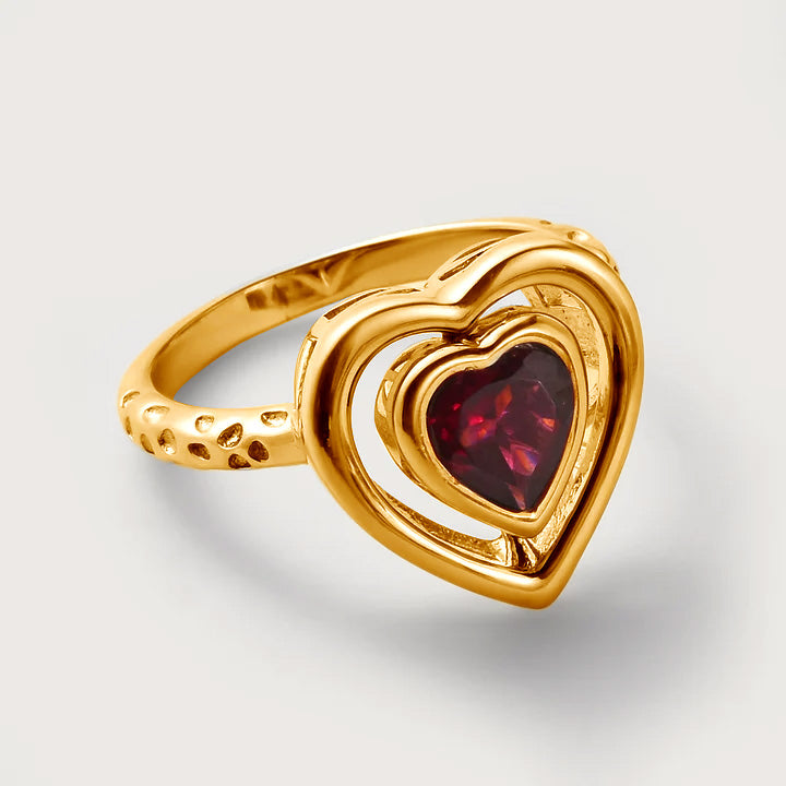 Klassische Herzform gepaart mit Rachels Ansatz des Minimalismus. Dieser Ring verfügt über einen funkelnden und facettierten Rhodolit-Granat in der Mitte, der in einer drehbaren Kontur befestigt ist. Das Band ist mit Allegro-Details versehen.