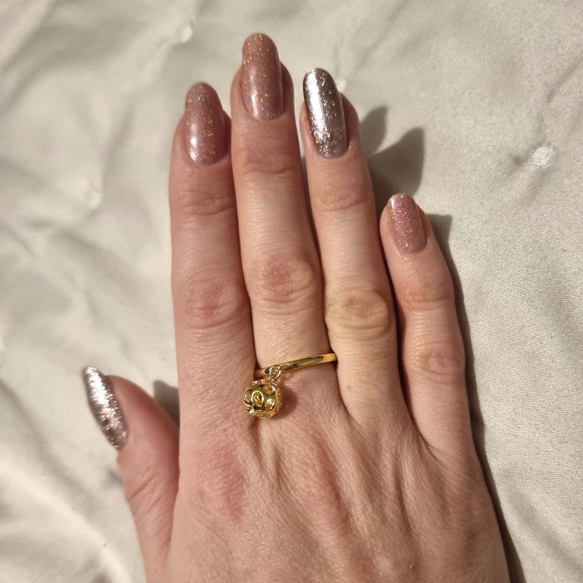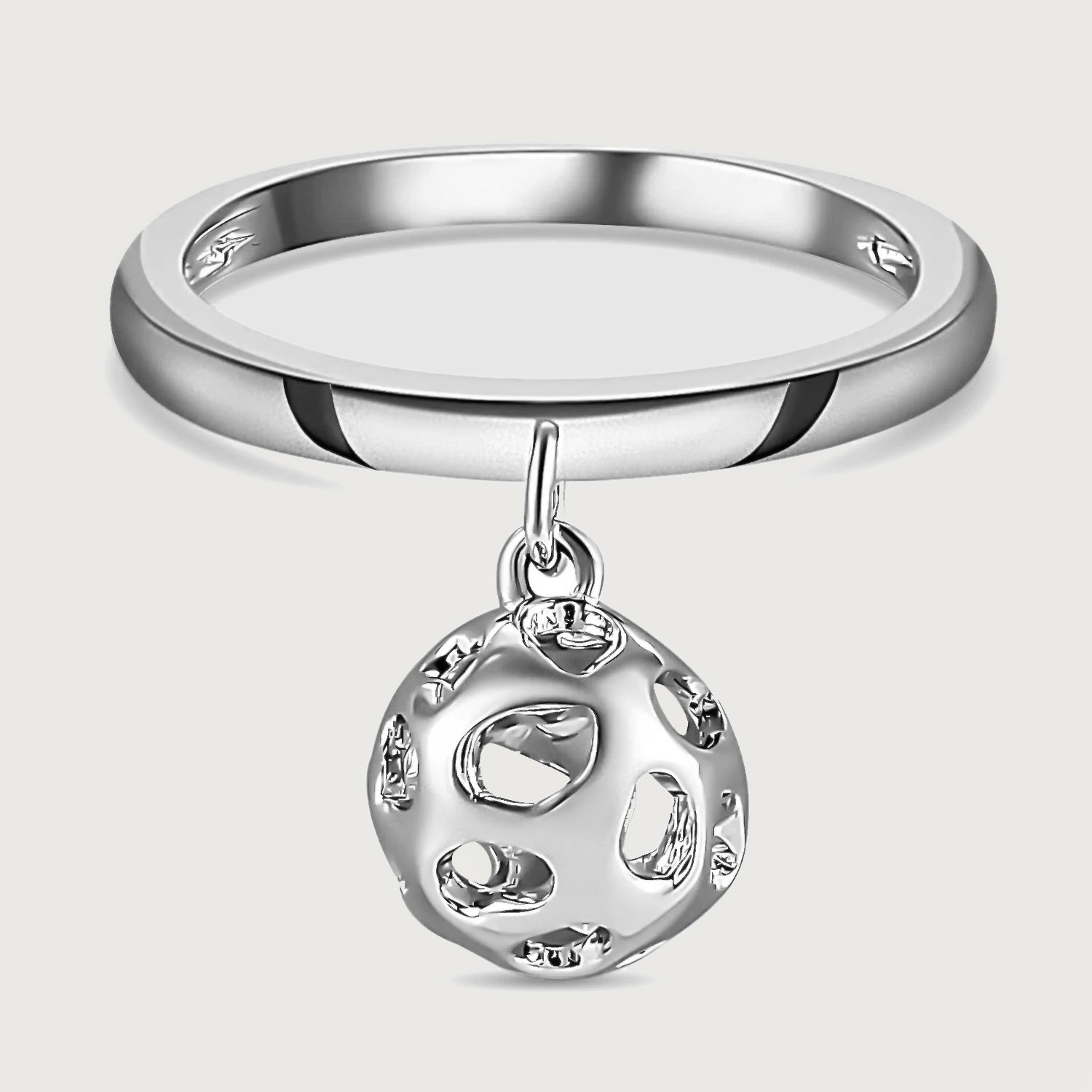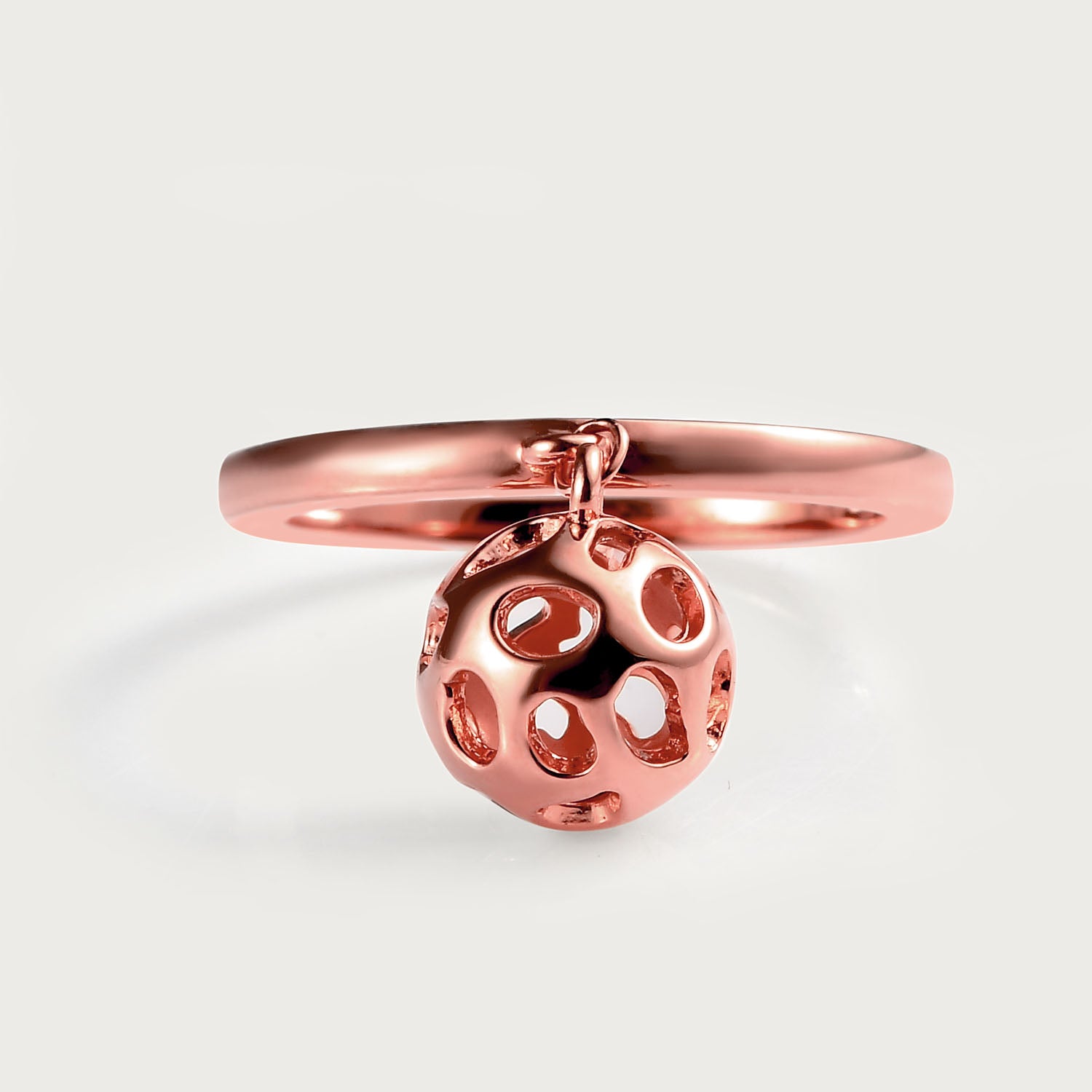 Eine unterhaltsame neue Art, modernen Schmuck zu tragen! Dieser atemberaubende Ring verfügt über einen Mini-Globus mit Rachels charakteristischem Gitterwerk. Der fein verzierte Anhänger bewegt und schimmert mit der Bewegung Ihrer Hand. Das schlanke, glatte Band bildet einen hervorragenden Kontrast zum detaillierten Globus.
