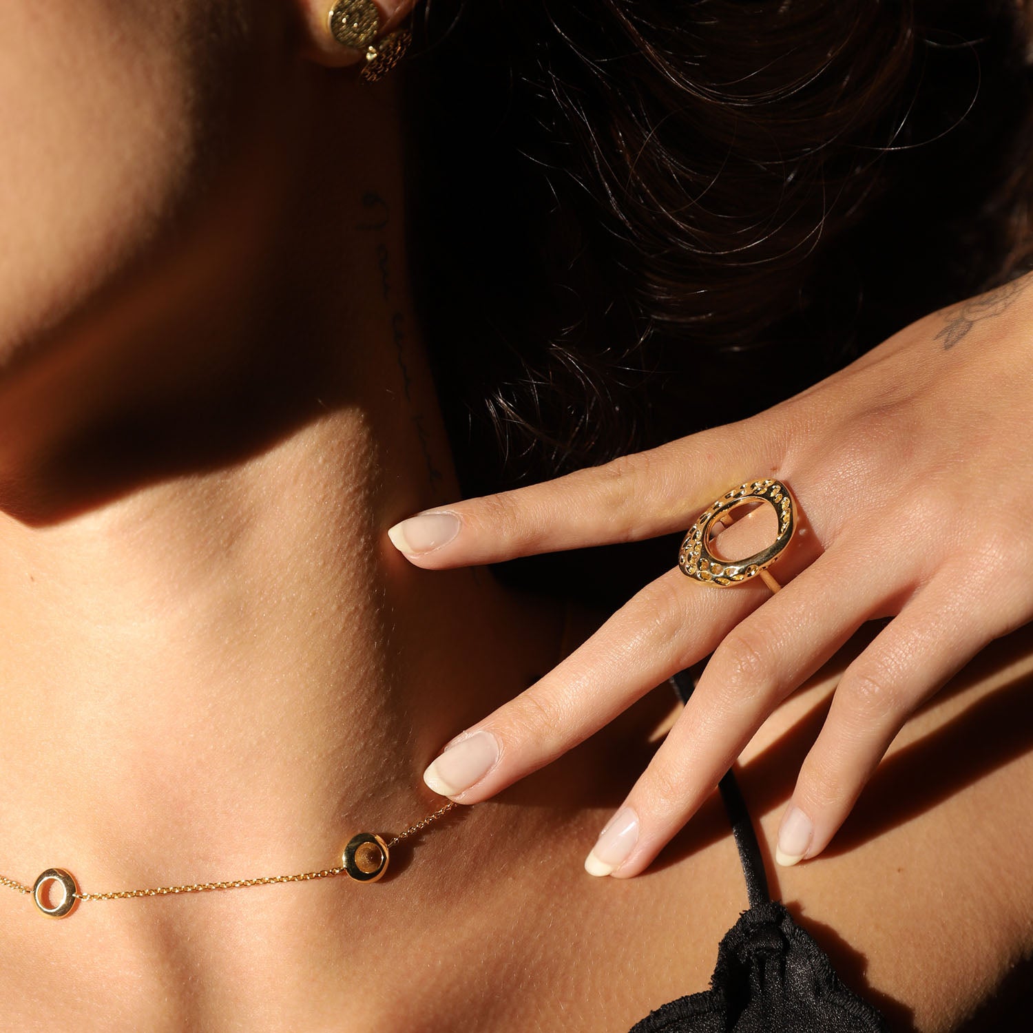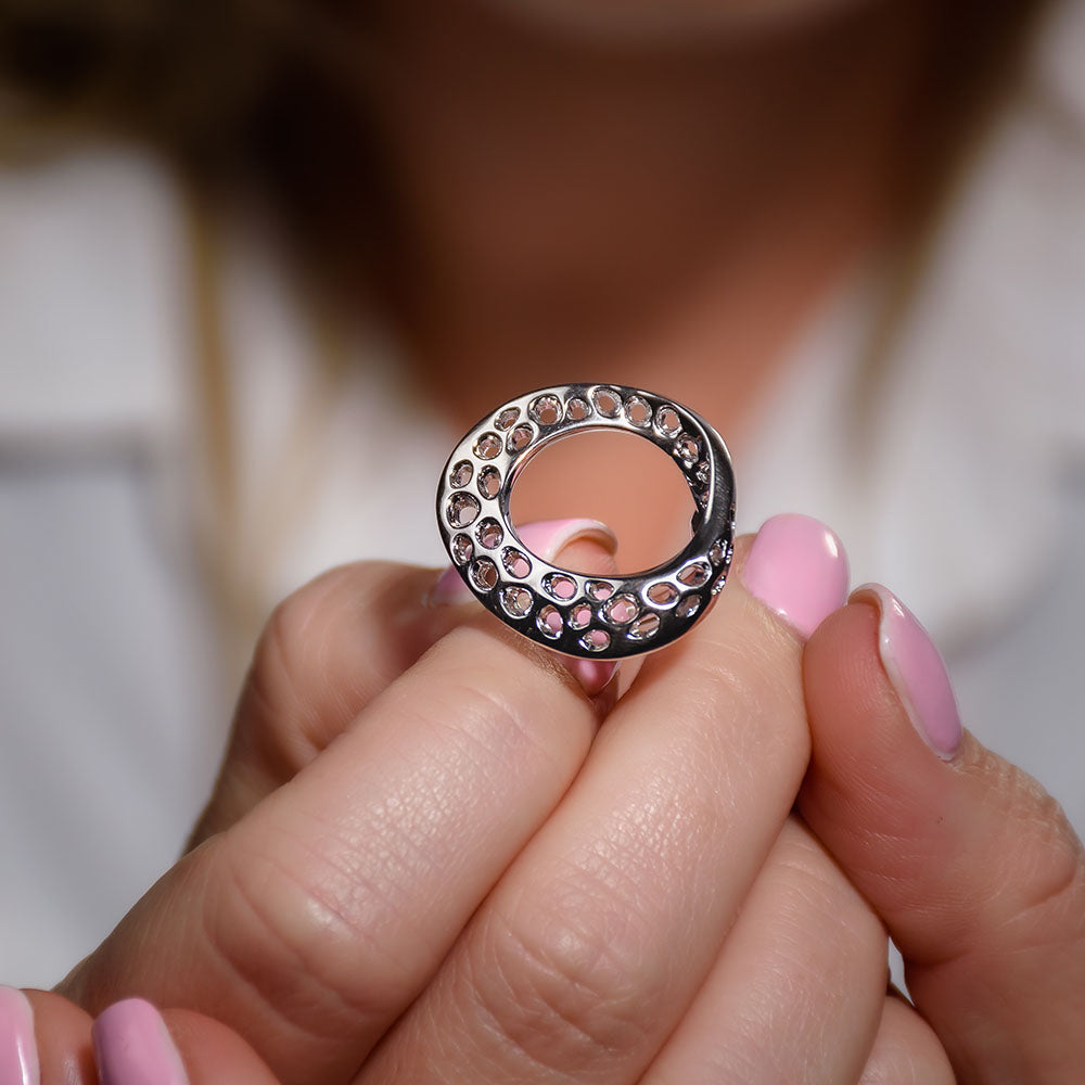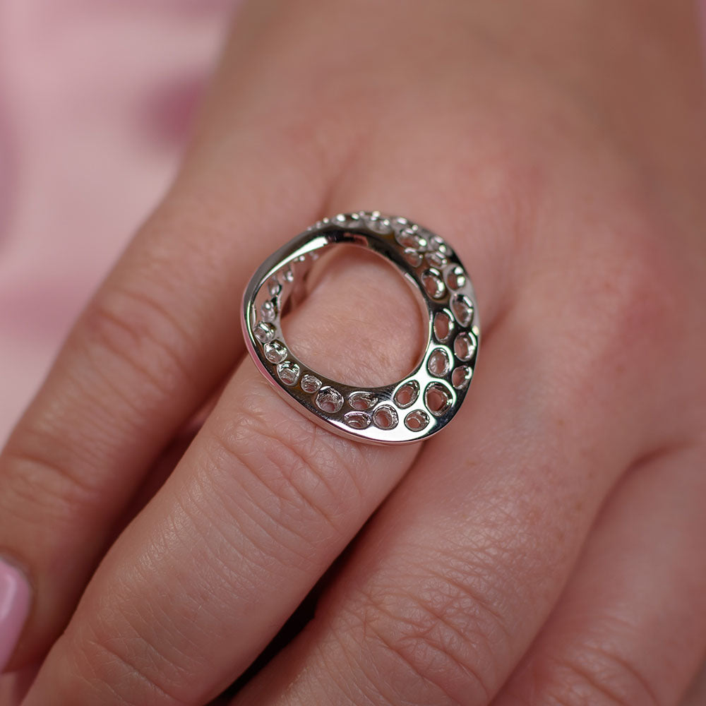 Zu den Statement-Stücken von Rachel gehört ein wunderschöner Designerring. Mit der Signatur des Chaos ist dieses Design eine genaue Darstellung der Suche nach dem Perfekten im Unvollkommenen. Mit ihrem charakteristischen Gitterdesign versehen, kann dies ein atemberaubendes Herzstück für Ihre Stapel sein.