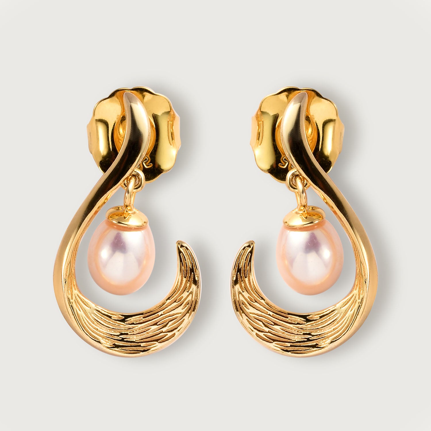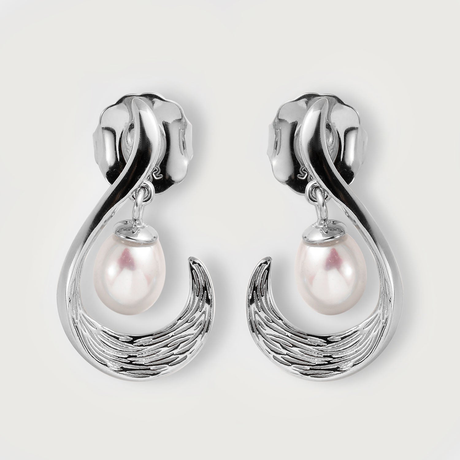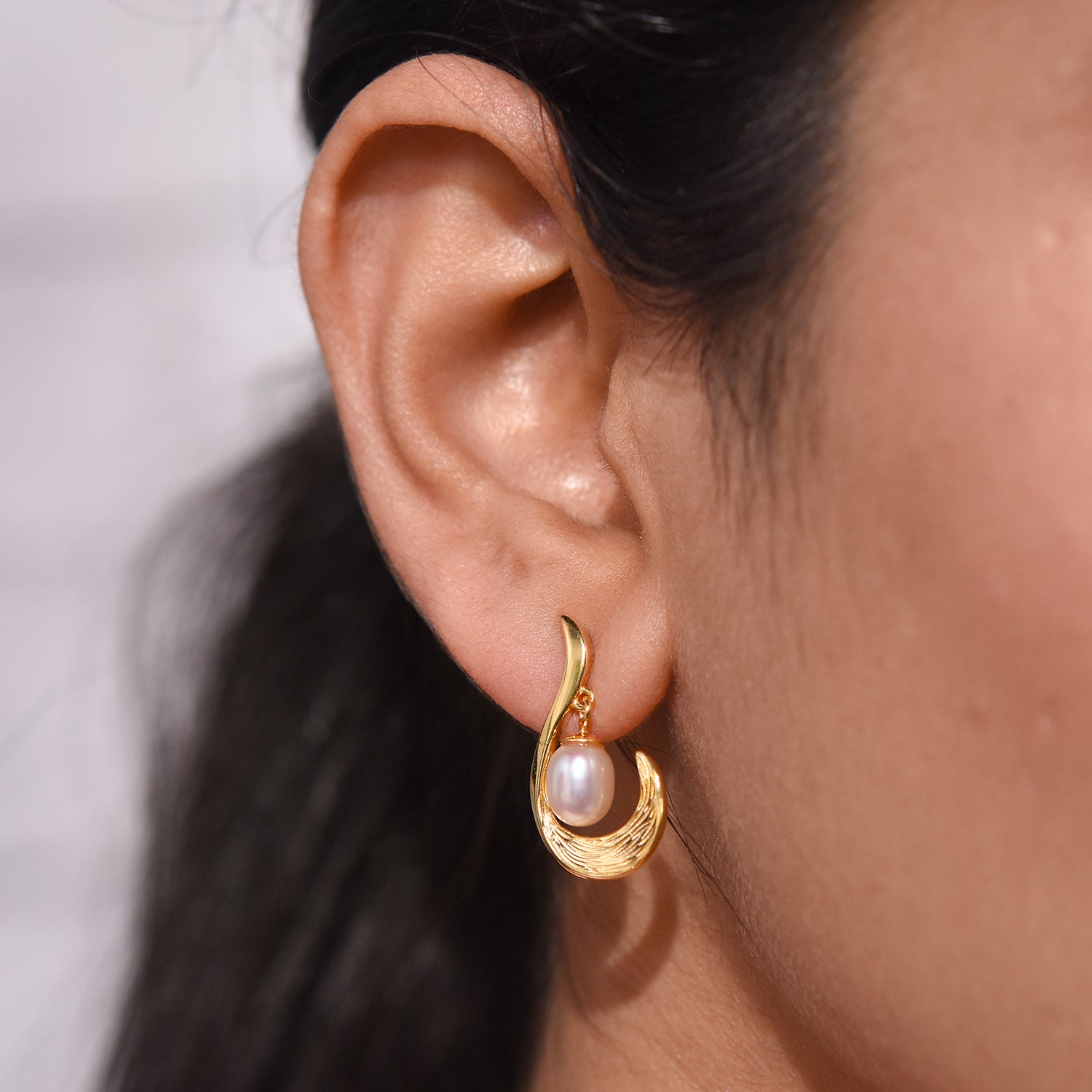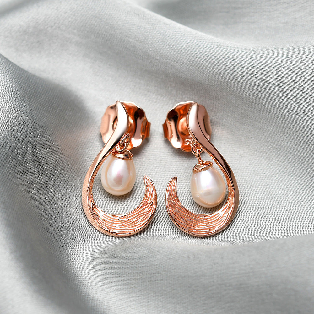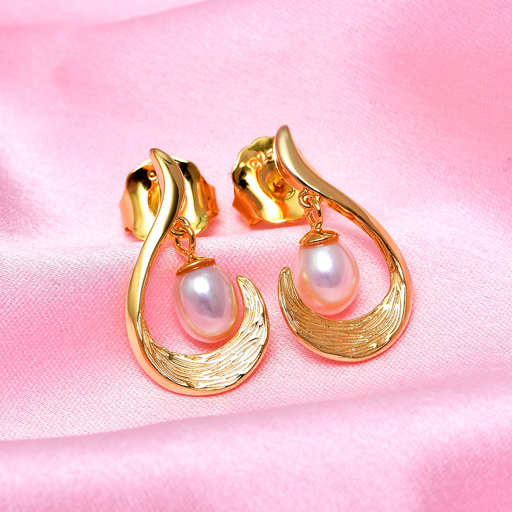 Elegante und vielseitige Ohrhänger, die die Schönheit des Ozeans zu Ihnen bringen. Der Pfosten ist mit Wellenbewegungen strukturiert und in der Mitte des Designs hängen weiße Süßwasserperlen, die wunderschön baumeln und sich bewegen. Jede Süßwasserperle ist natürlich und stammt aus ethischen Gründen.