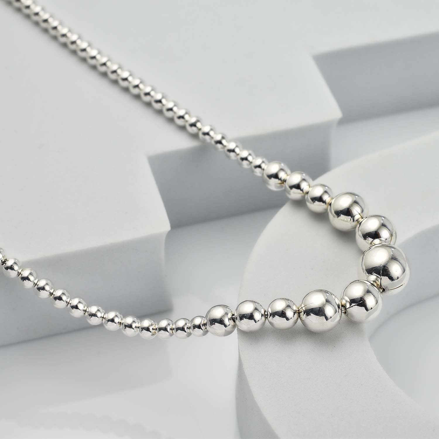 Essential Cascade Bead Necklace – A timeless piece featuring smoothly graduated silver beads that flow gracefully along an 18-inch chain. Crafted in lustrous silver, it’s perfect for adding effortless elegance to both everyday looks and special occasions.