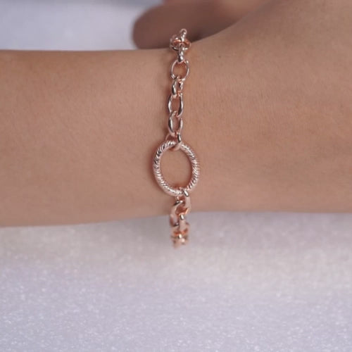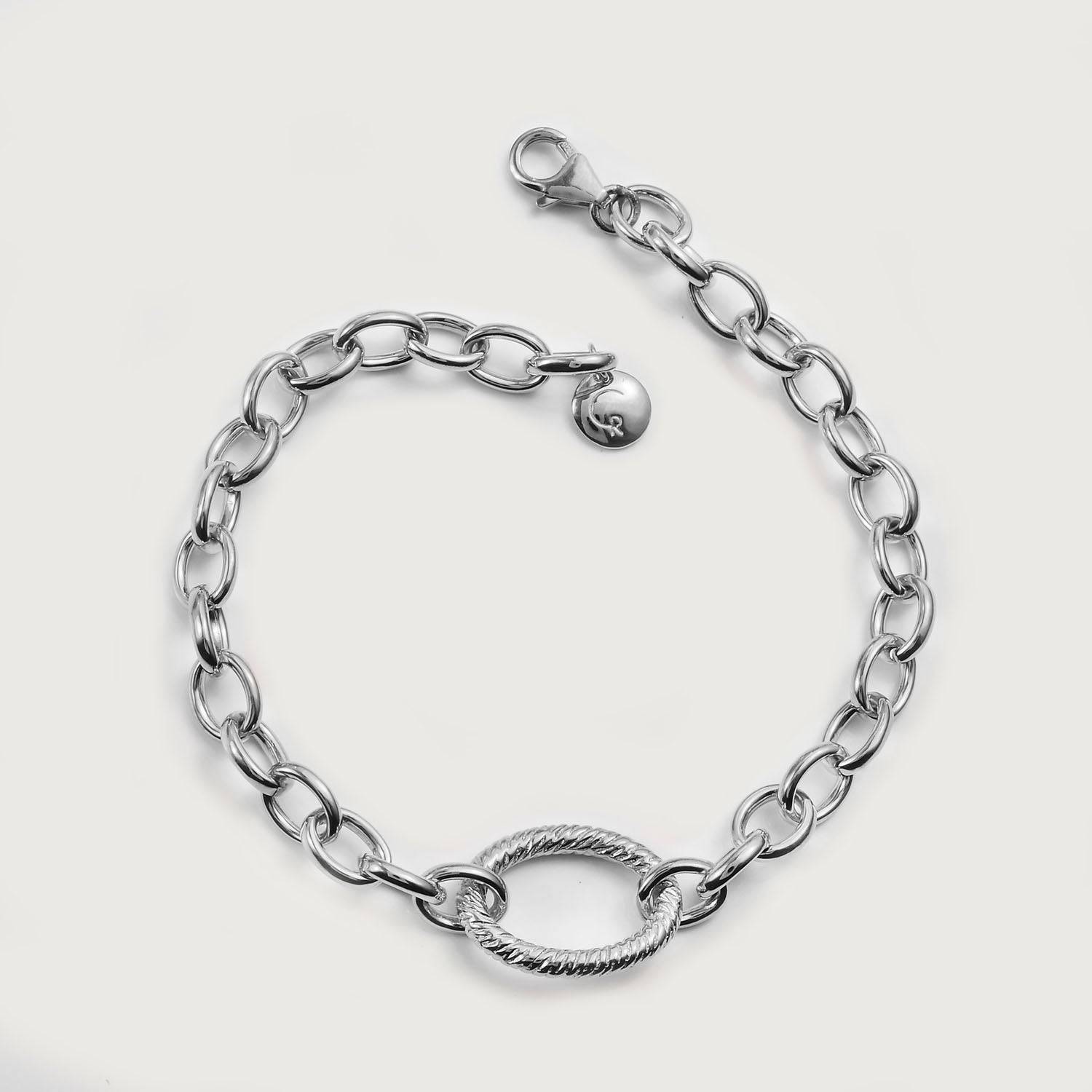 Inspired from the texture of waves and their power, this bracelet is a mix of minimalism and excellence. A textured link brings chained elements together in the centre. The bracelet is accompanied with a signature Rachel Galley charm at closure.
