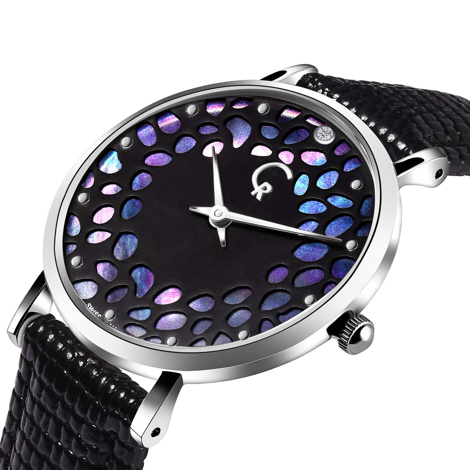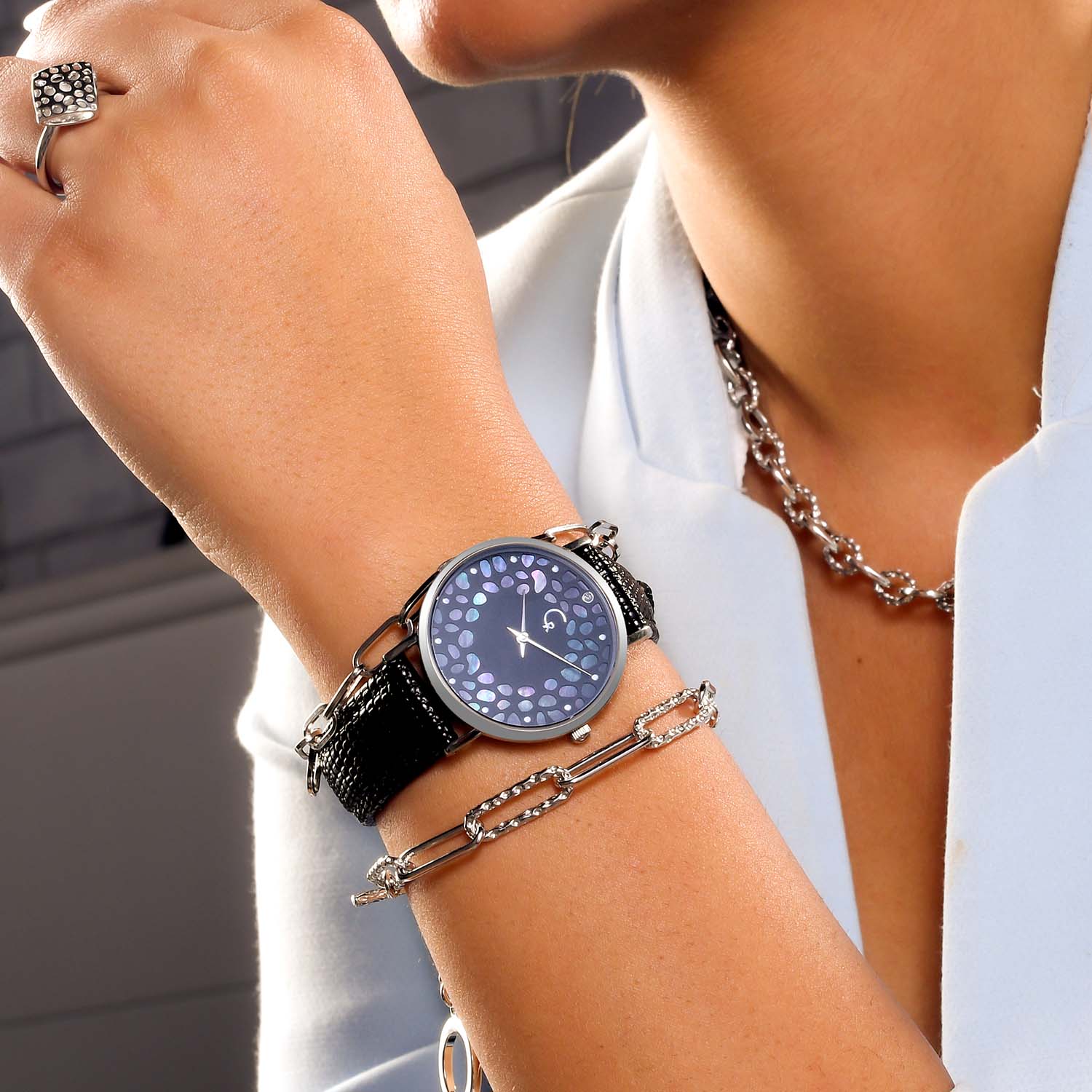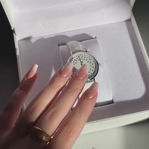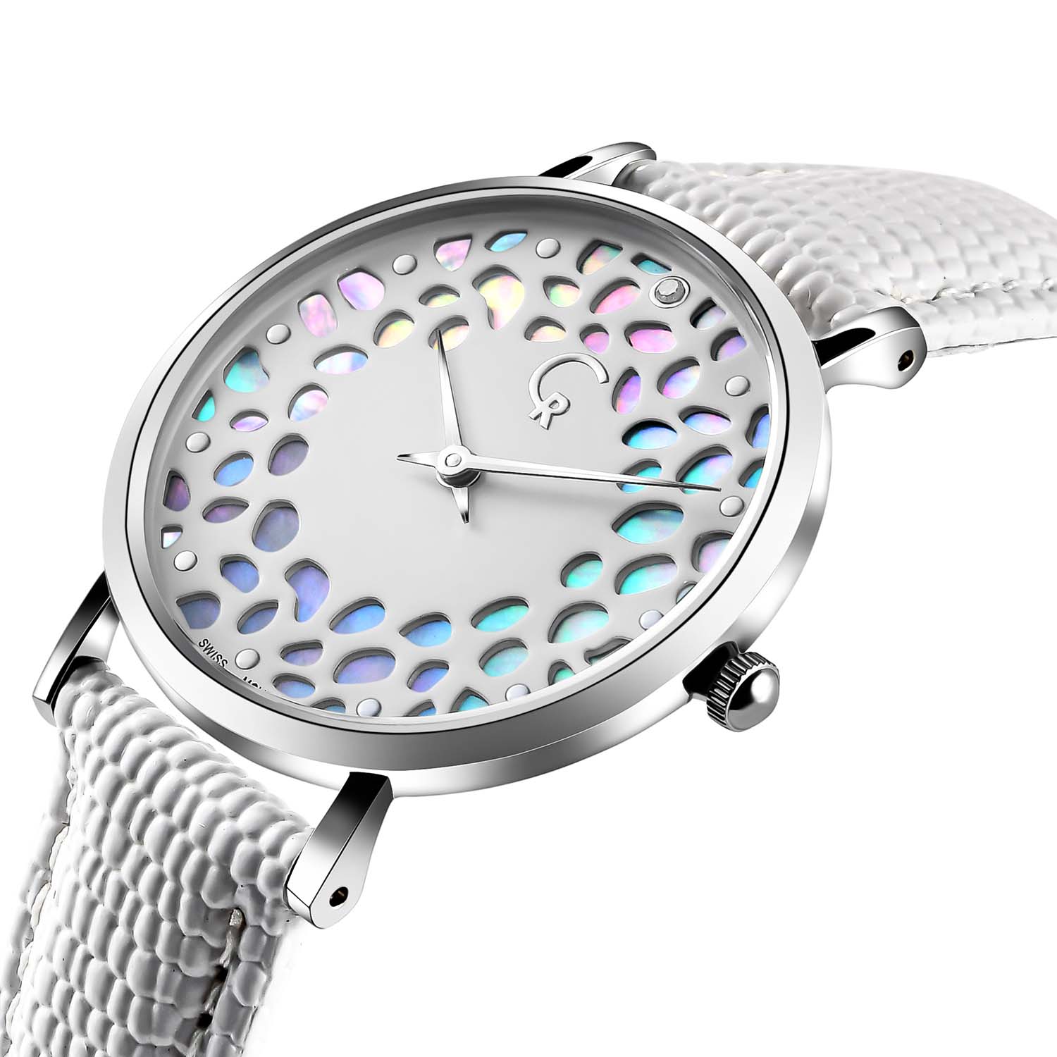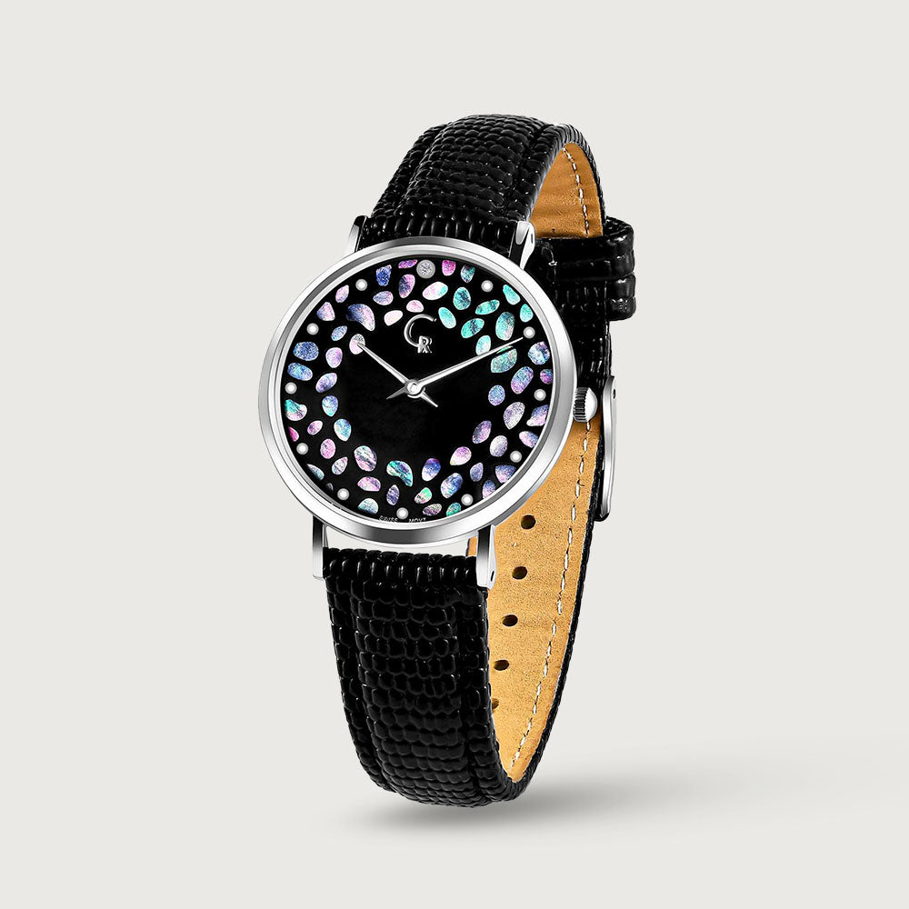 A signature timepiece by Rachel, featuring face of the dial made in Mother of Pearl. Studded with a diamond, the design fashions her popular lattice art.
