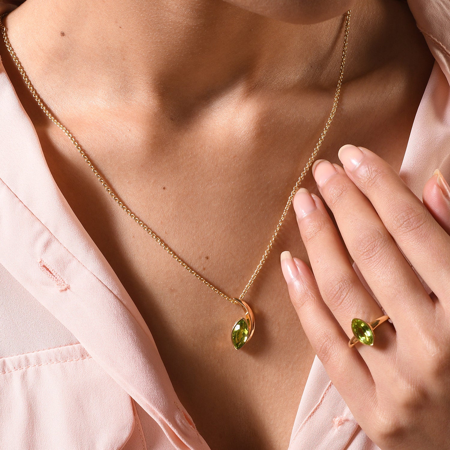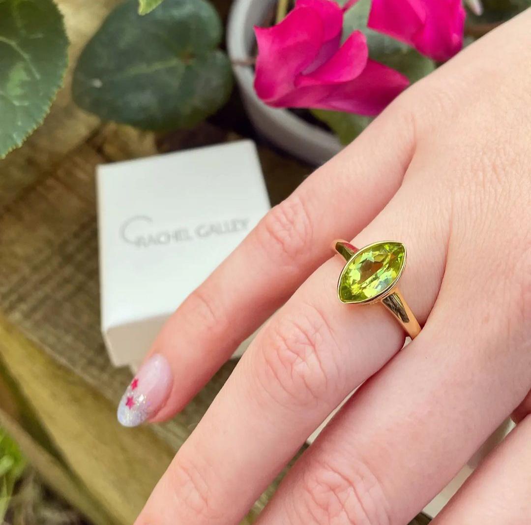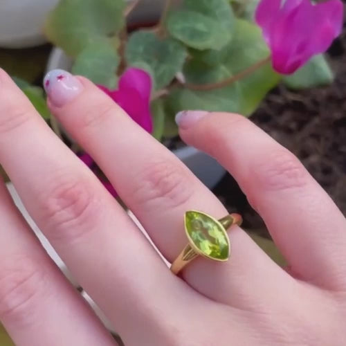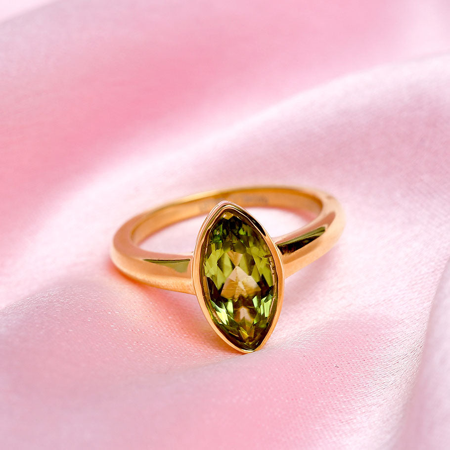 Featuring the beauty of a crescent moon and olive green colour, this ring will be the centre of all talk. Marquise-cut peridot is bezel-set is set in the centre. A solitaire design to pair with all your looks.