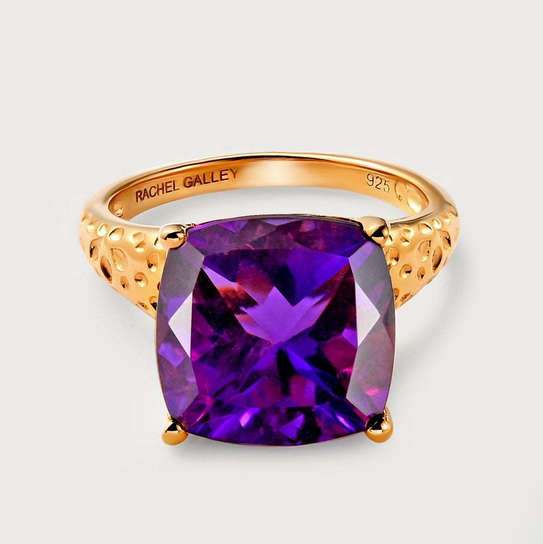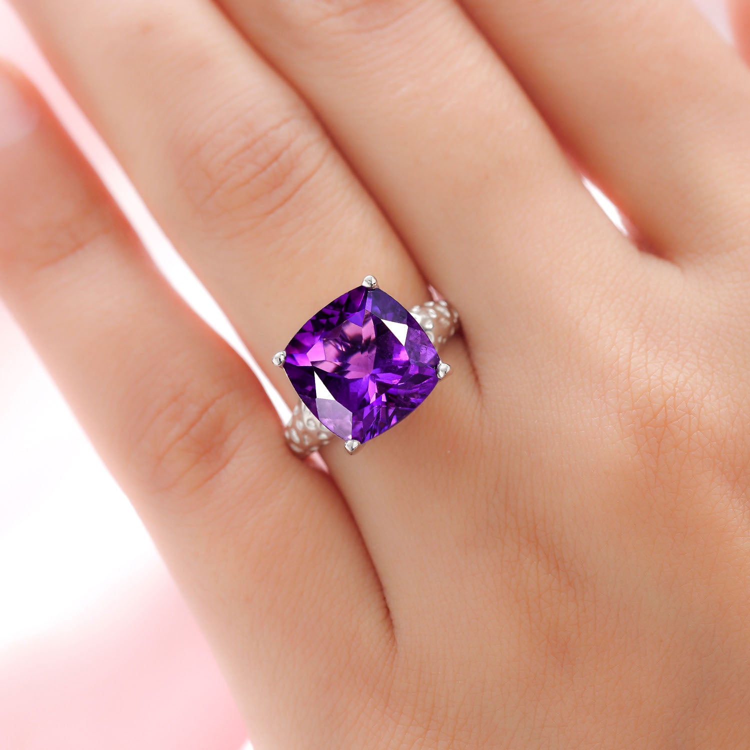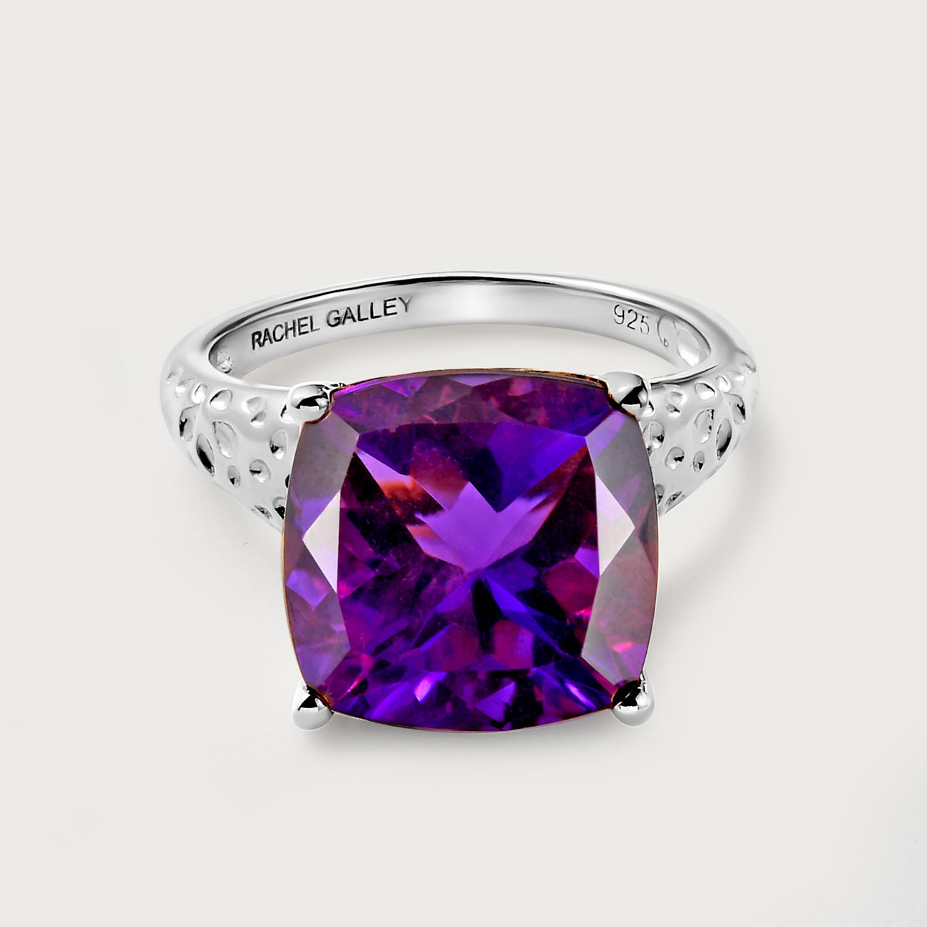 Make a bold statement with this iconic solitaire ring, featuring Rachel's signature allegro texture. Prong-set in the centre is cushion-cut natural genuine amethyst of a whopping 12x12 mm size! Wear alone or pair well with other stacking rings, it's bound to make heads turn!