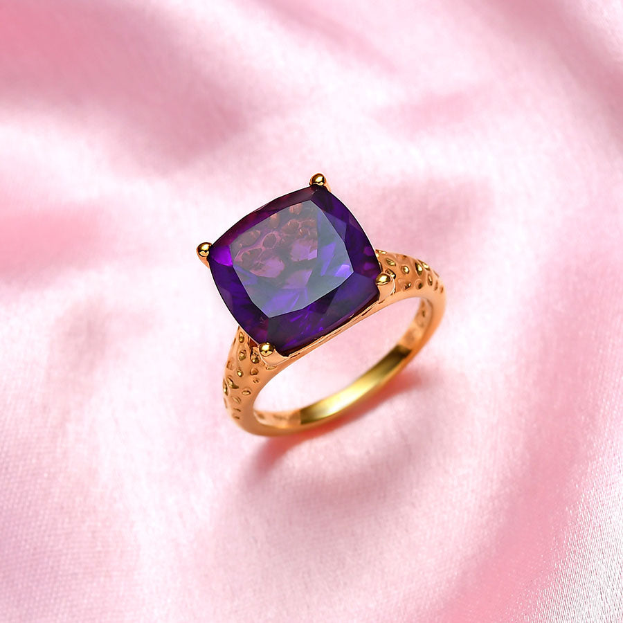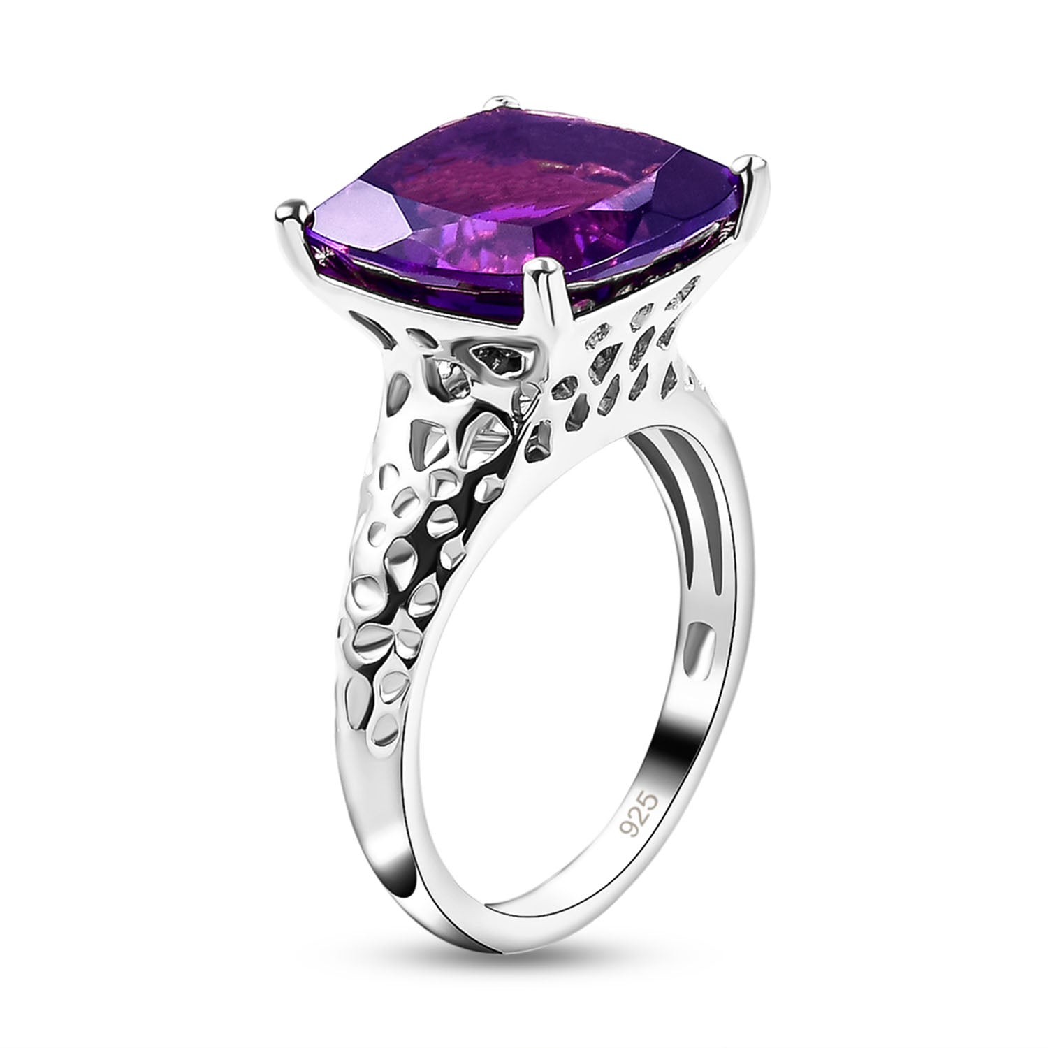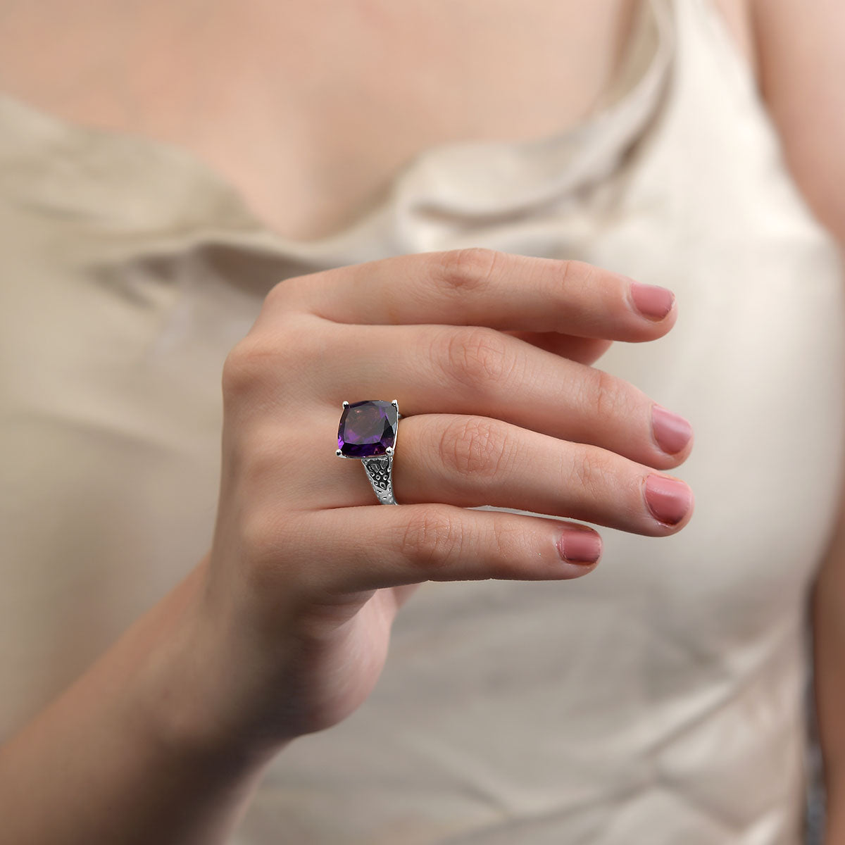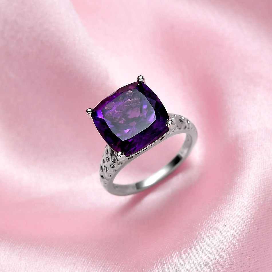 Make a bold statement with this iconic solitaire ring, featuring Rachel's signature allegro texture. Prong-set in the centre is cushion-cut natural genuine amethyst of a whopping 12x12 mm size! Wear alone or pair well with other stacking rings, it's bound to make heads turn!