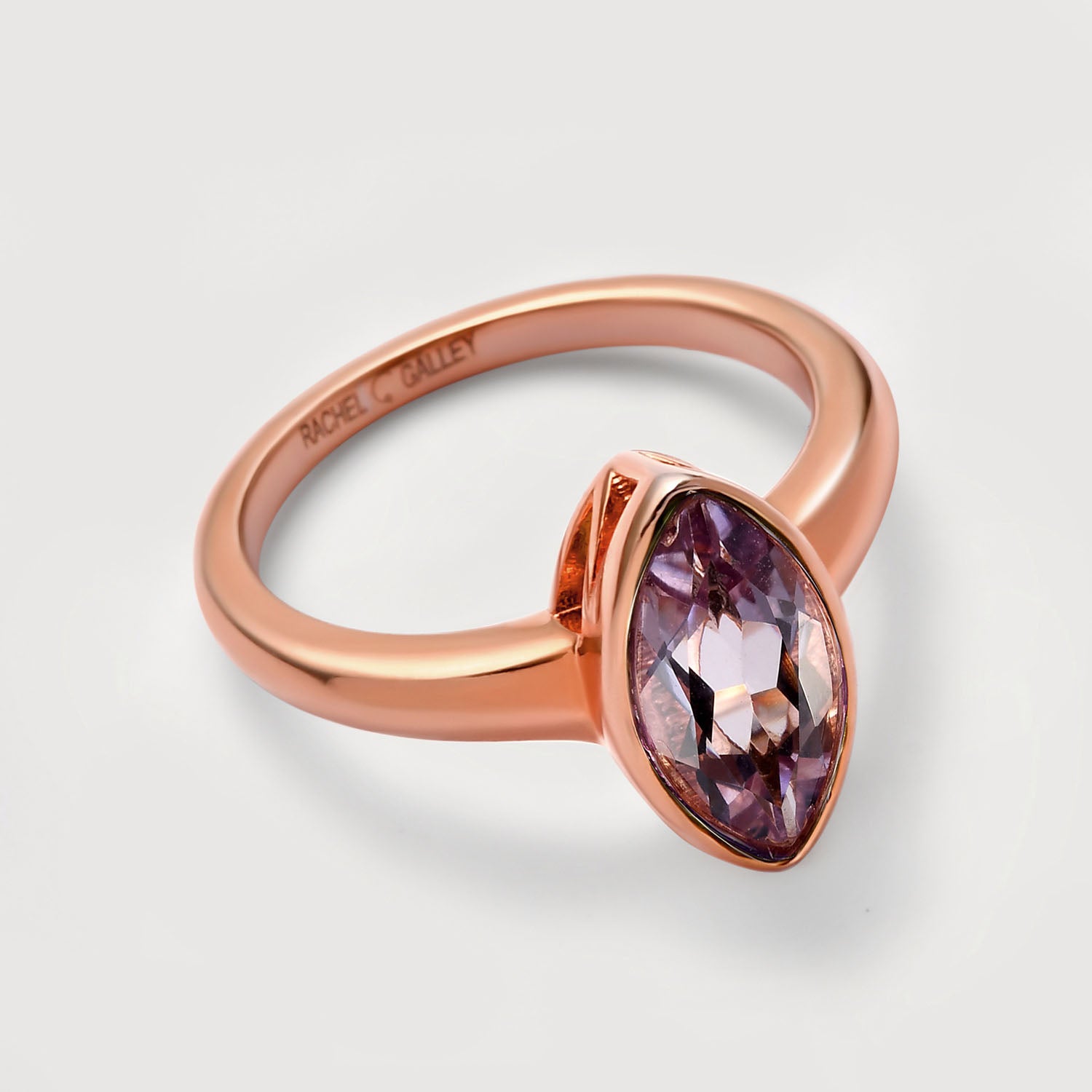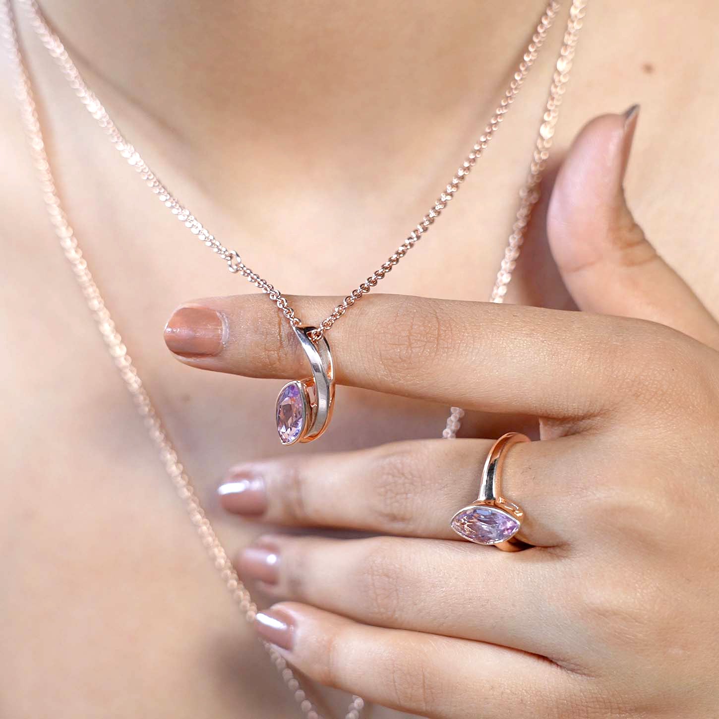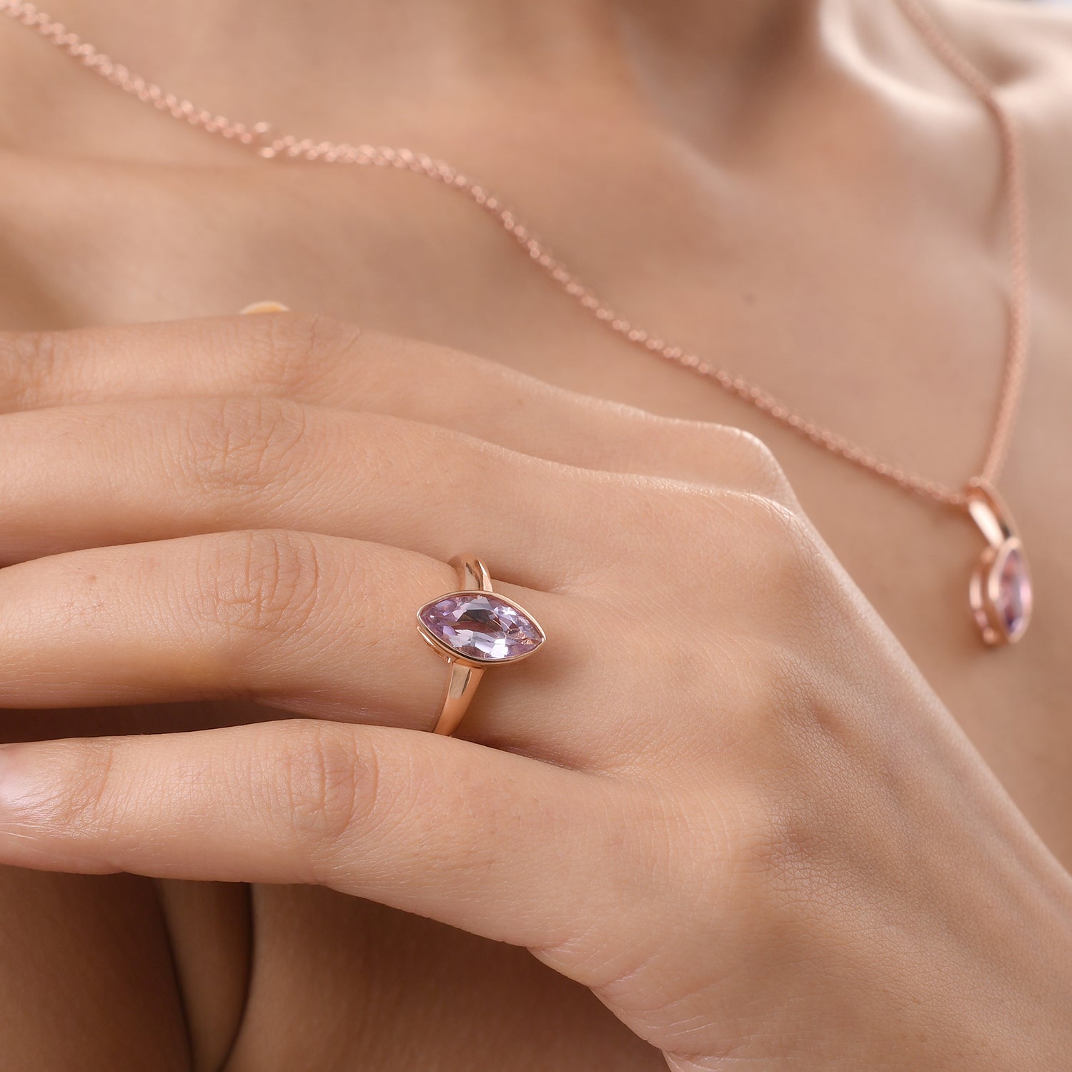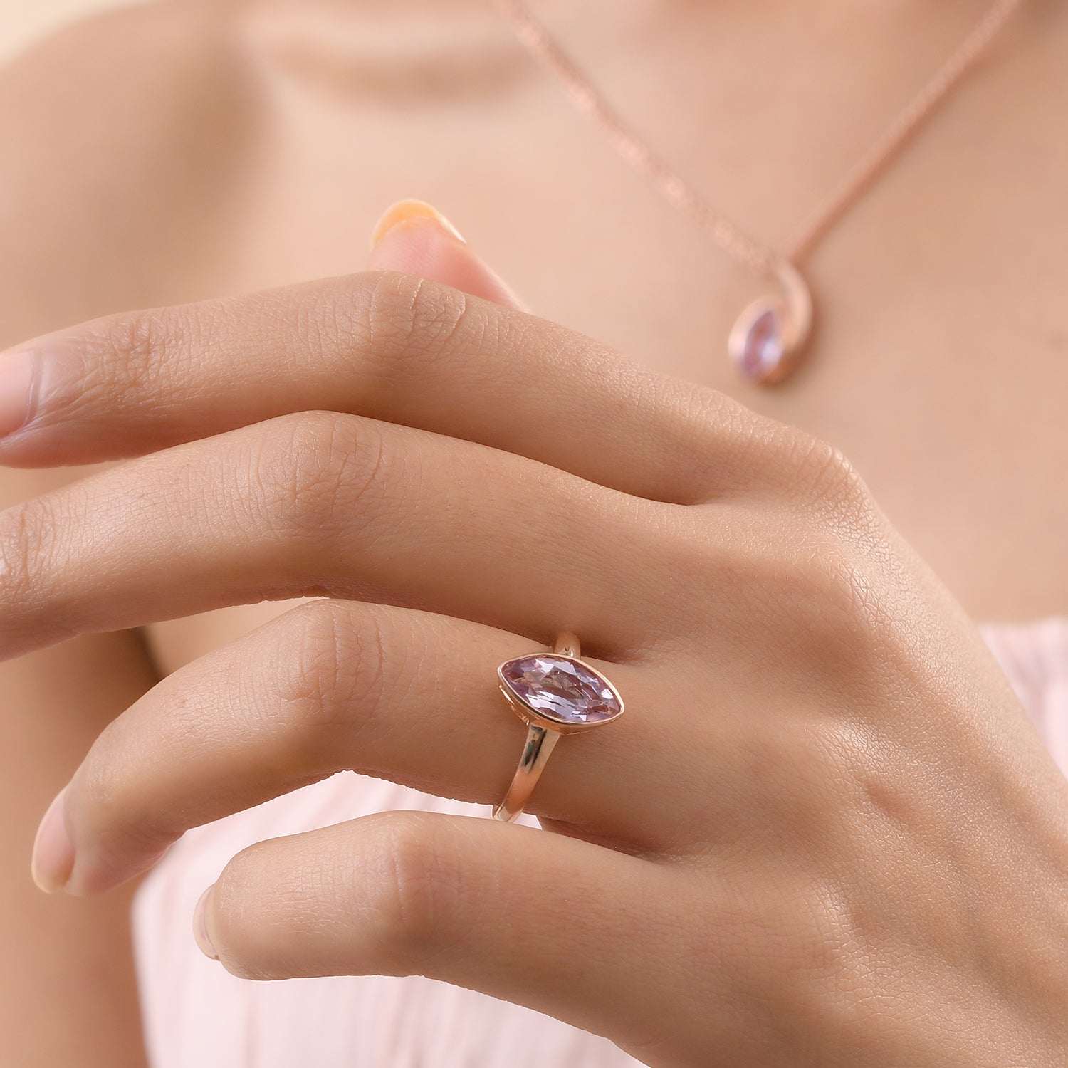 Featuring the beauty of a crescent moon and colour of pink roses, this ring will be the centre of all talk. Marquise-cut pink amethyst is bezel-set is set in the centre. A solitaire design to pair with all your looks.