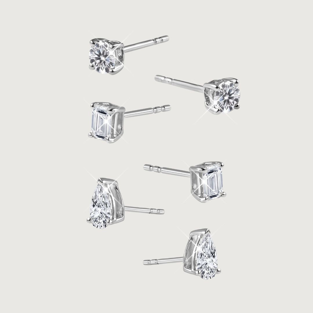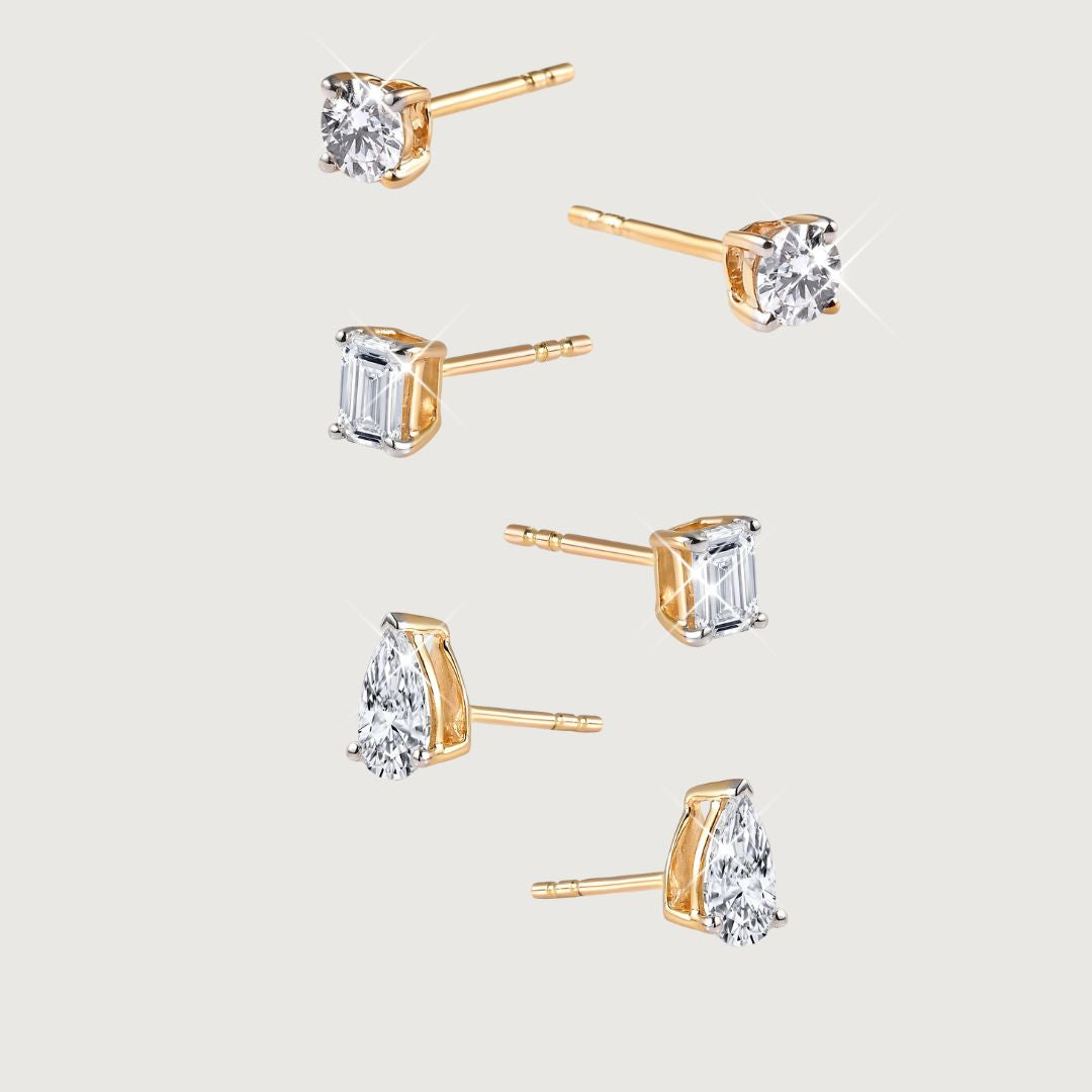 Versa 9K Gold Lab Grown Diamond Classic Stud Earrings Set of Three Round, Pear & Emerald