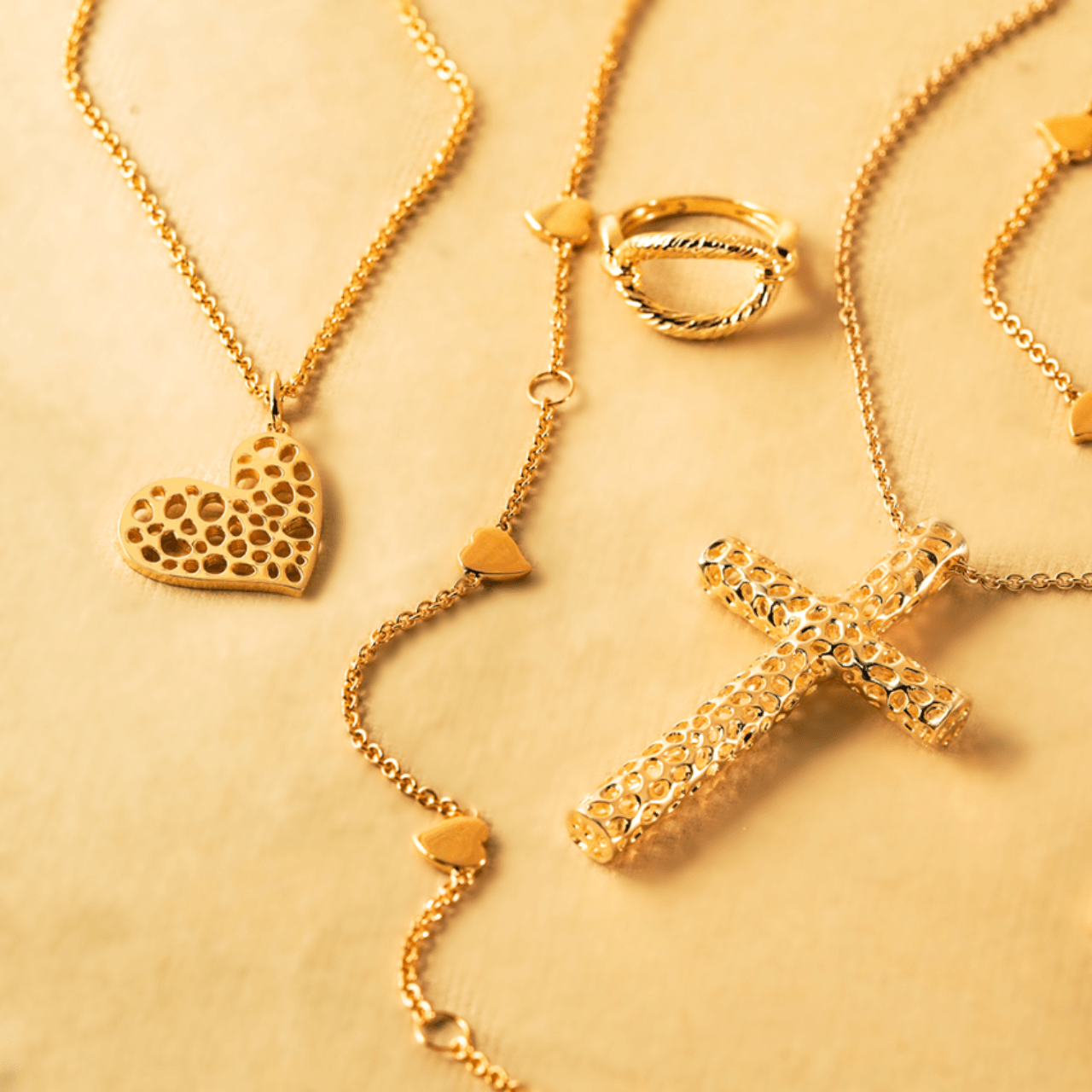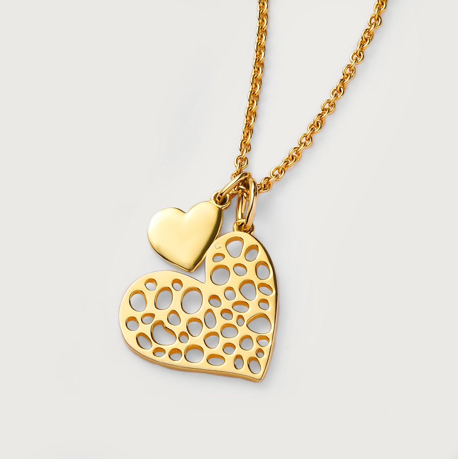 Lattice Heart Charm Necklace + Ouro Floating Heart Charm Bracelet in 9K Gold