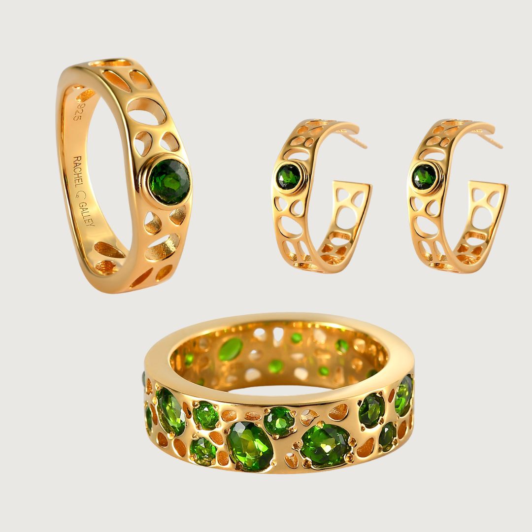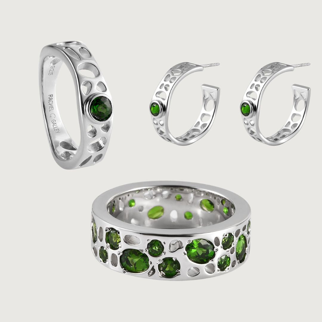 Diopside Lattice Band Ring + Lattice Solitaire Ring with Chrome Diopside + Lattice Solitaire Hoops with Chrome Diopside