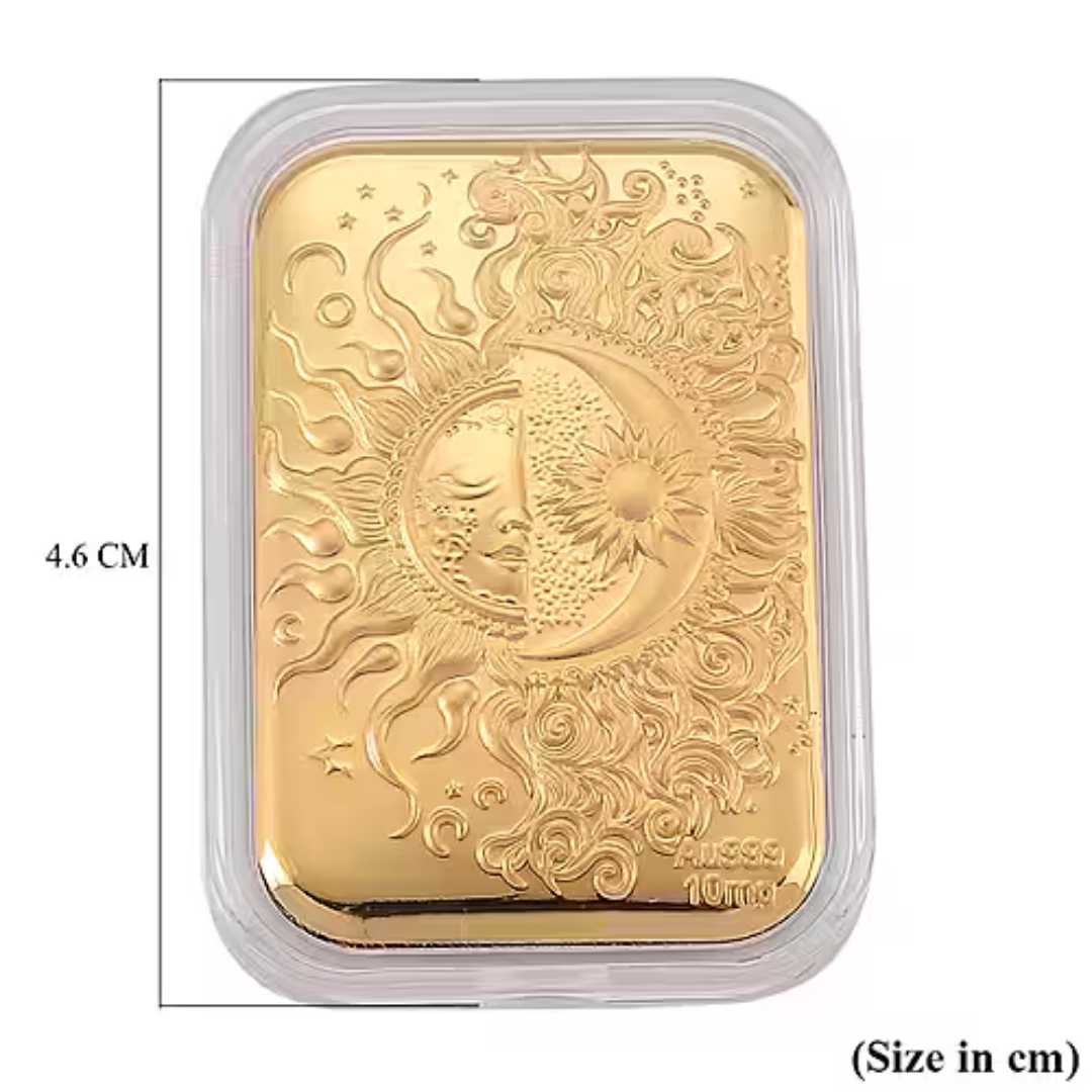 The piece features an intricate sun and moon embossed celestial design, symbolizing balance, renewal, and inner guidance. Its detailed engraving and radiant glow lend a beautiful visual depth, showcasing premium craftsmanship despite its incredibly lightweight nature.