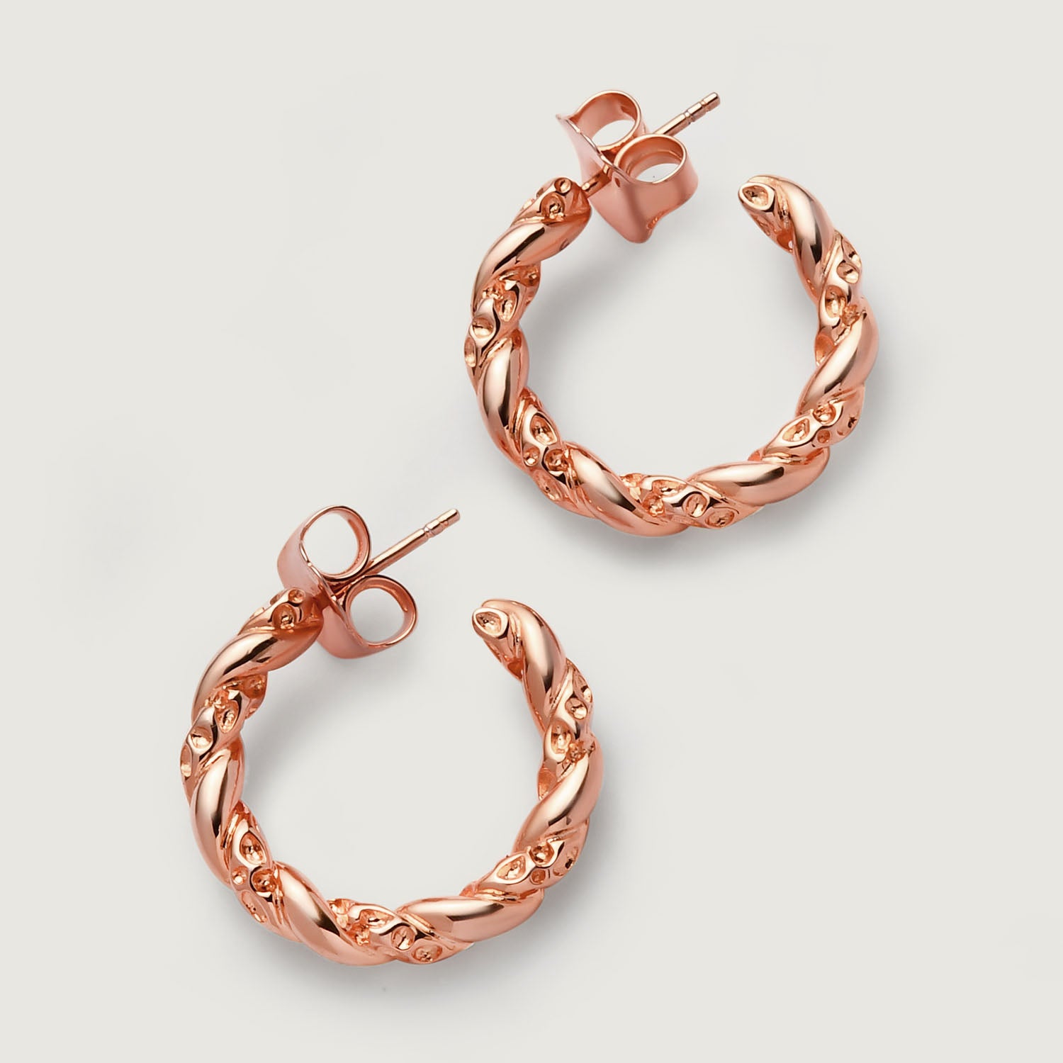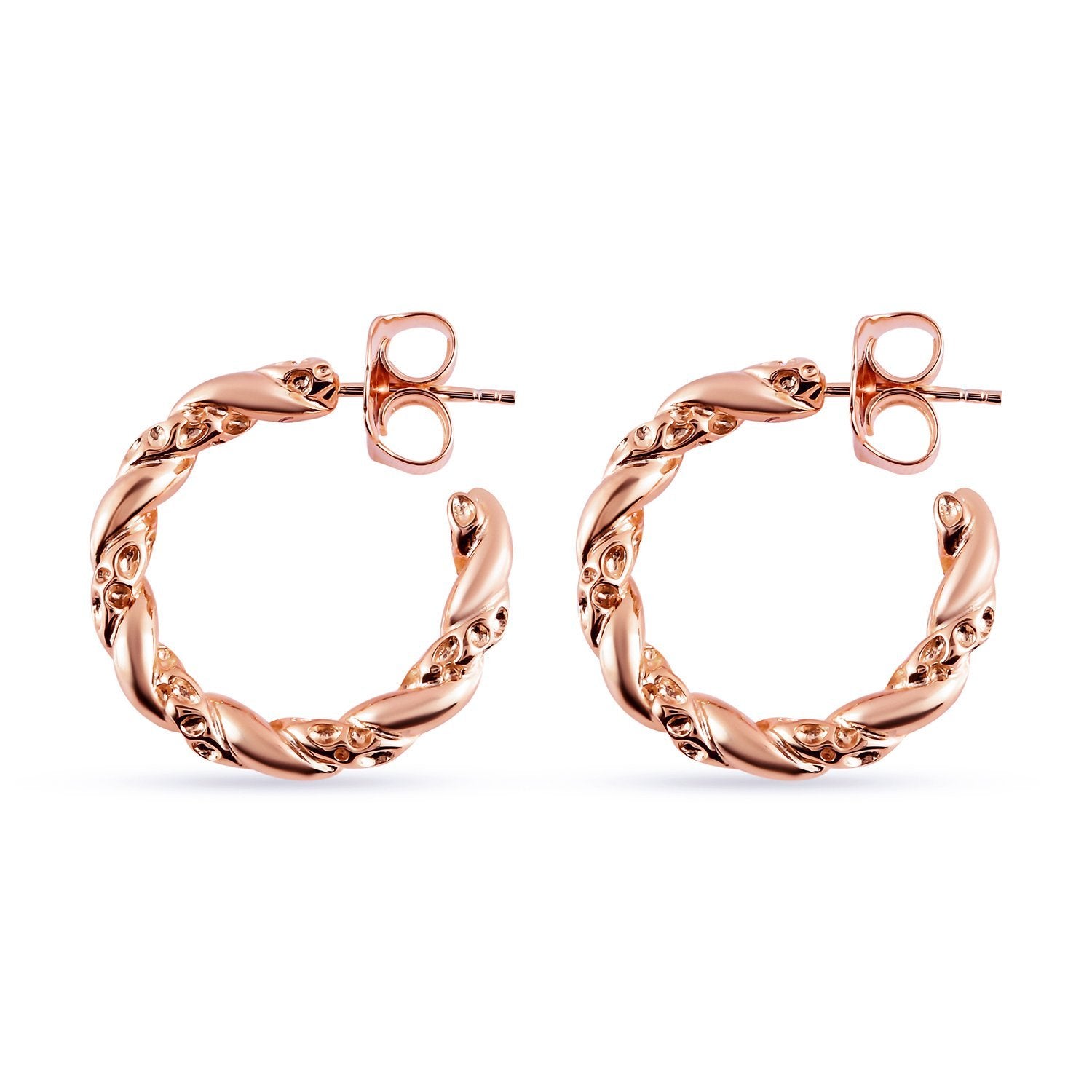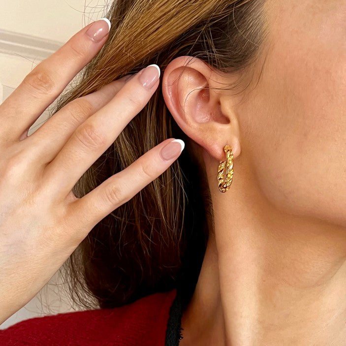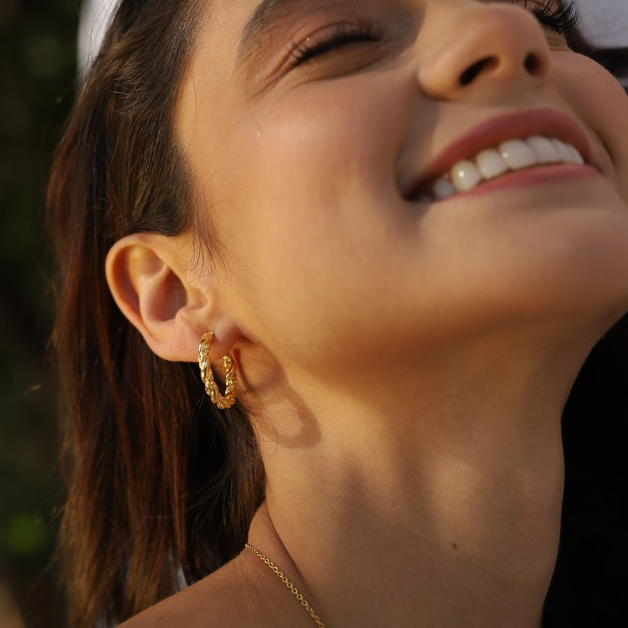 Wear the classic grace of gold hoop earrings paired with Rachel's signature latticework. The shiny small hoop earrings cover two-third portion of a circle to give you ease of wear and comfort as well.