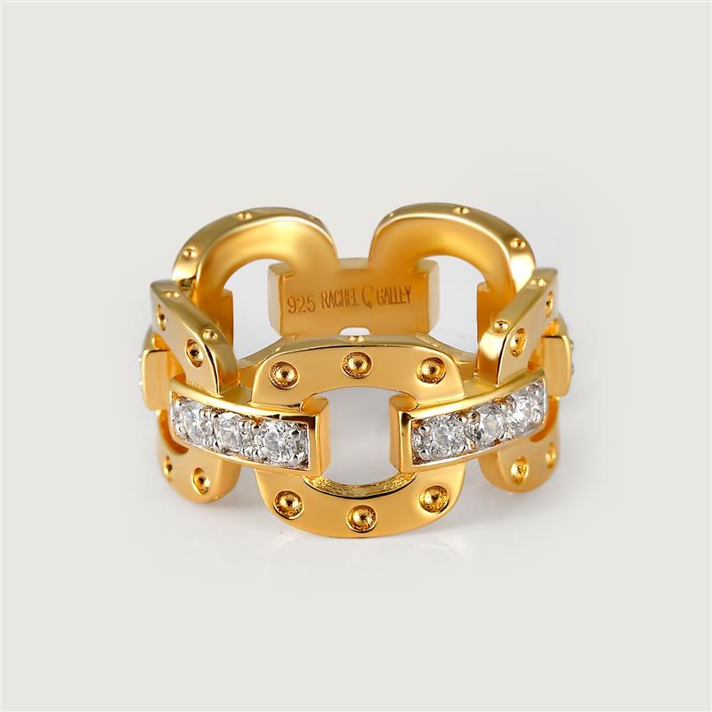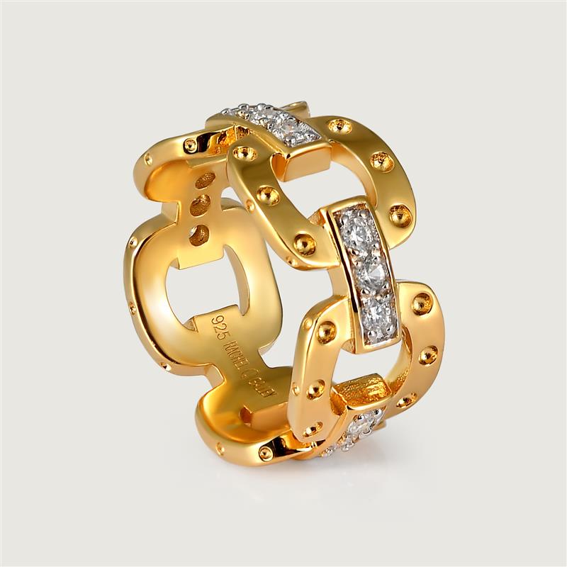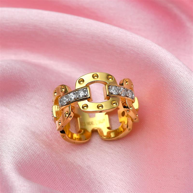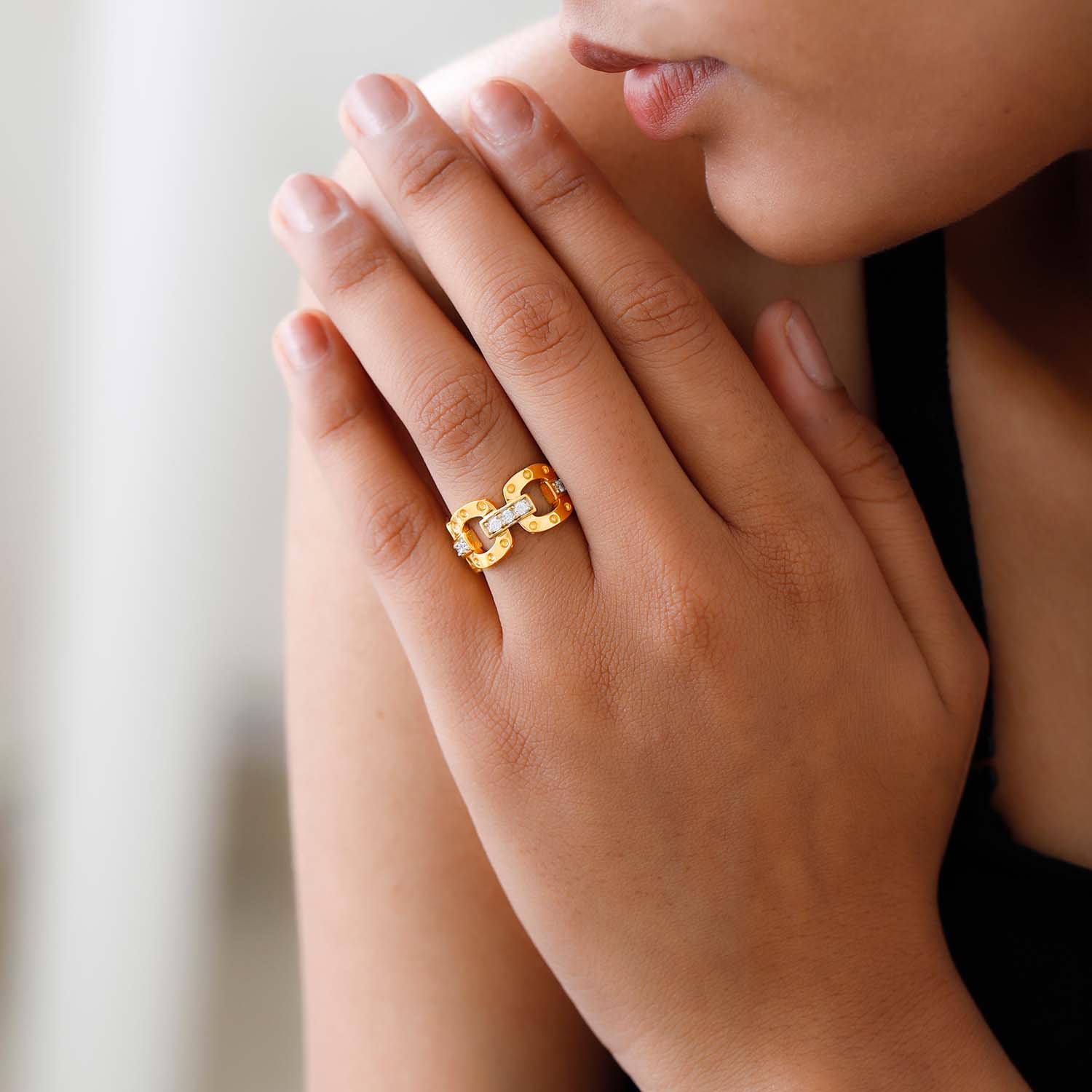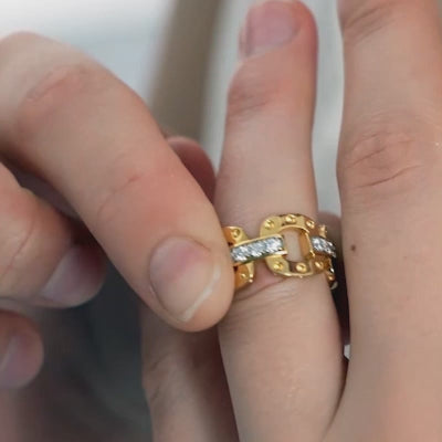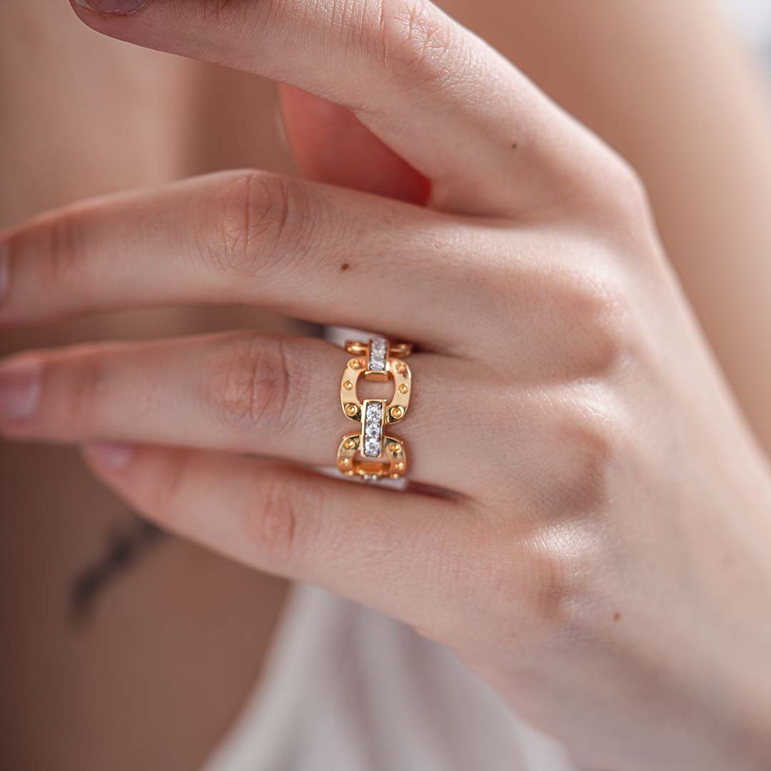 A bold design that's been made for every day. Add the shine of diamonds at fraction of cost, with moissanite stones embedded in alternate links. Detailed band ring can be paired with other stacking rings.
