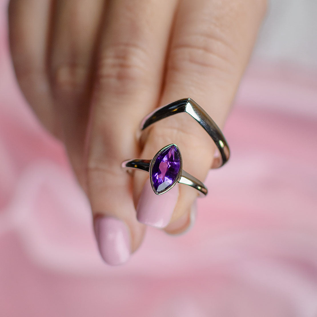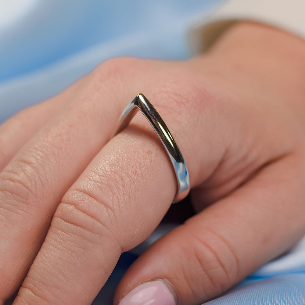A striking wishbone shaped ring, fits comfortably around the finger with the rounded shank and then features a pointed focus point to add drama and edge to the piece.