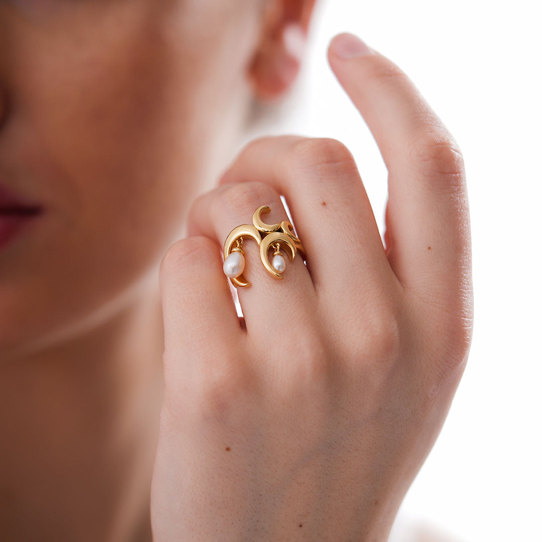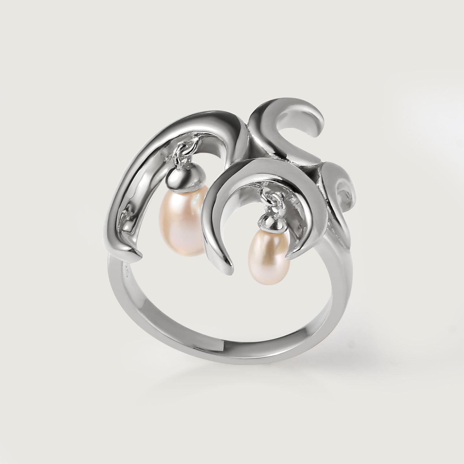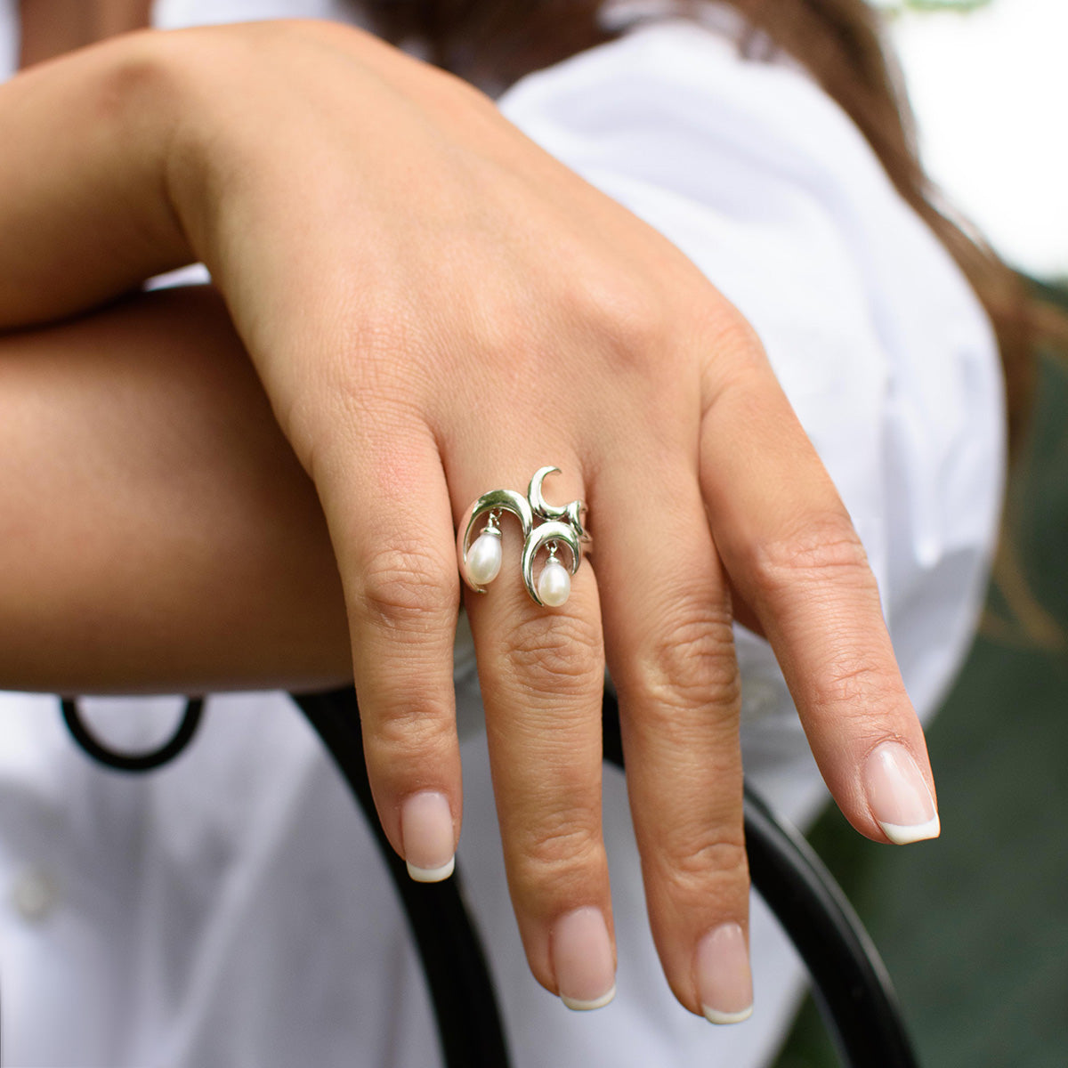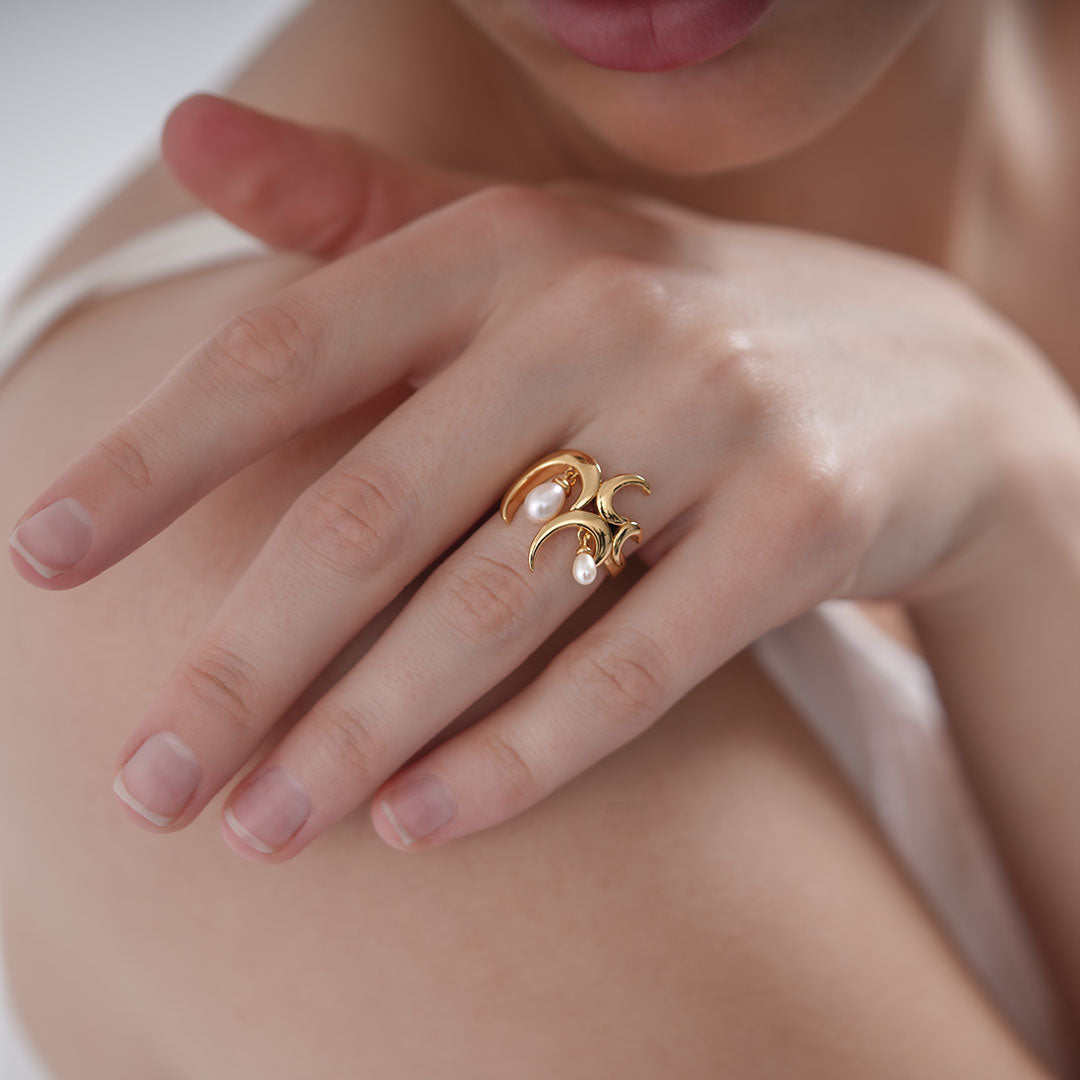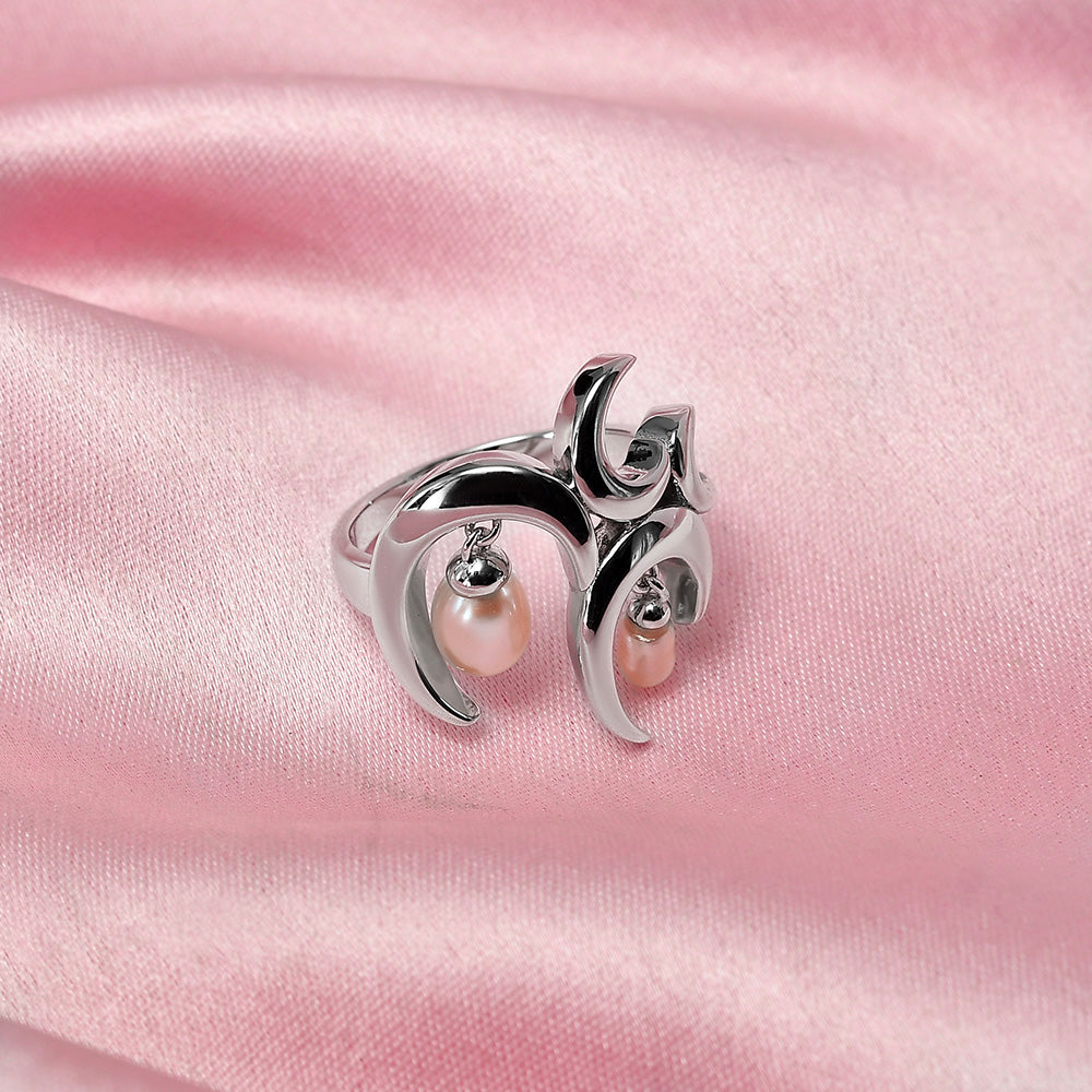 Add the magic of freshwater pearls to your look with this unique statement charm ring. Studded with dangling freshwater white pearls embedded in an artistic wave design, our signature Wave Ring with White Freshwater Pearls is that piece of accessory that everyone will about.